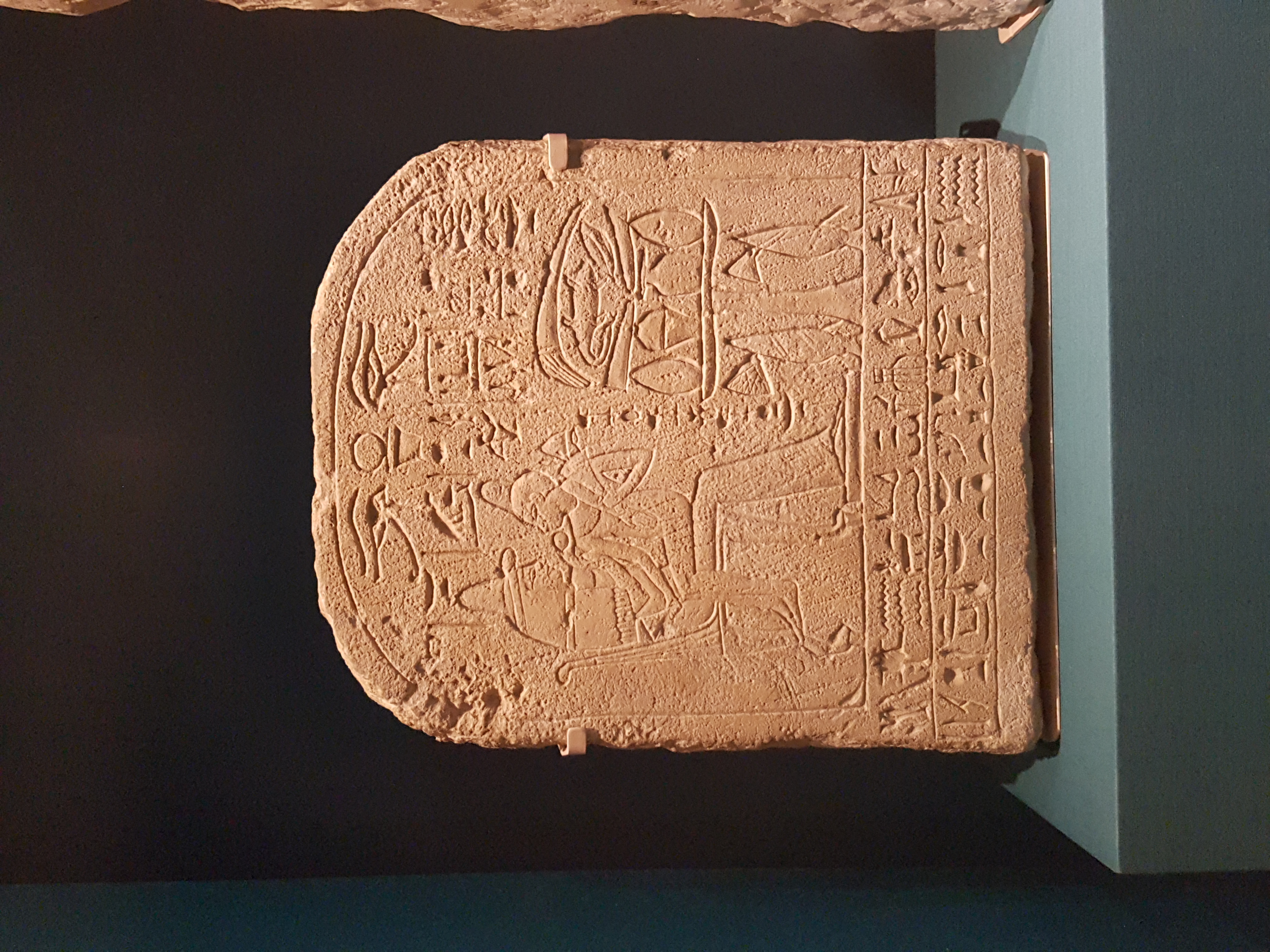This stela was made for a boy named Merysekhmet who appears to have died at a young age. He is shown sitting on his mother's knee while she holds a piece of fruit to his mouth. A heap of food and drink offerings is depicted on the right. It was rare for a child to have a funerary stela and this image suggests that Merysekhmet's mother was thought to act as an intermediary to who would ease his passage into the afterlife.