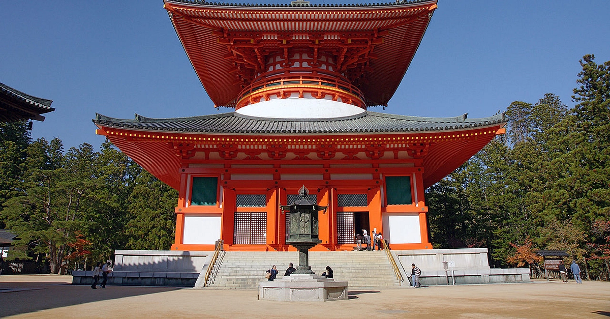 The Daito Pagoda of the Shingon Buddhist temple precinct of Danjo Garan, Mount Koya, Japan. First built in 816 CE, the structure was destroyed by fire but rebuilt in 1937 CE.