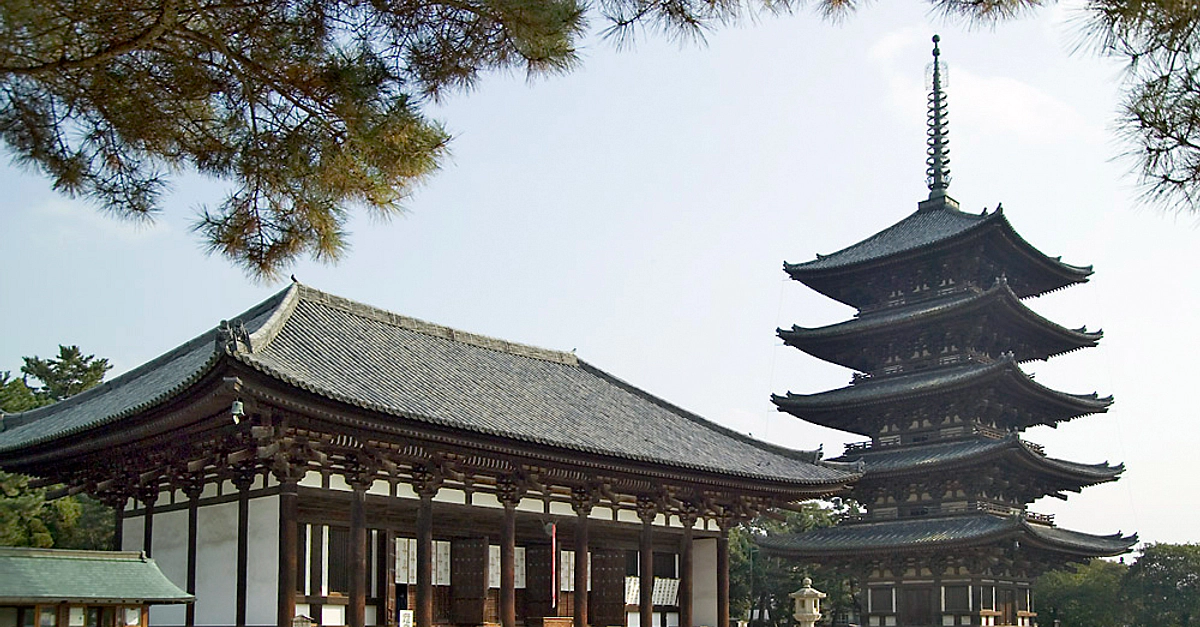 The Main Hall and pagoda of the Buddhist Kofukuji temple complex in Nara, Japan. Founded in 669 CE and moved to Nara in 710 CE.