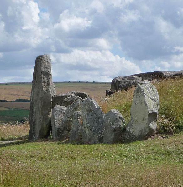 Outside of West Kennet Long Barrow, Wiltshire, U.K., showing the sarsen stones of the forecourt/facade. 3,500-2,700 BCE.