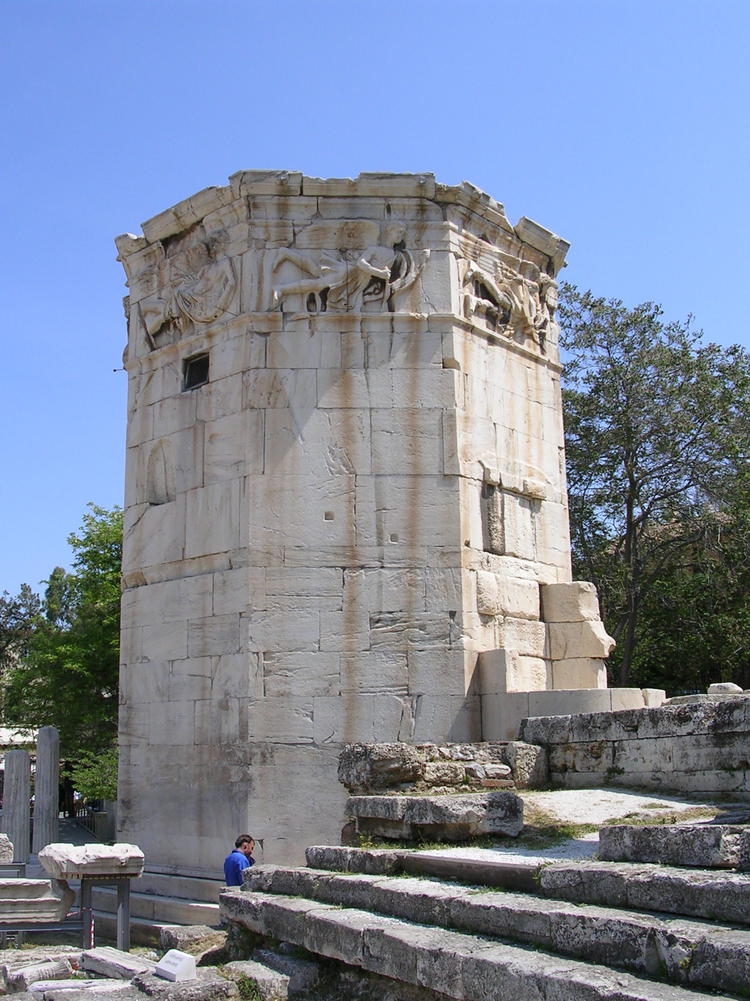 Also known as the Tower of the Winds because of the relief carvings of the eight winds near its top, this marble tower, built in the first century BCE, contained the clock which ran on water from the Acropolis spring. It was located in the Roman agora.