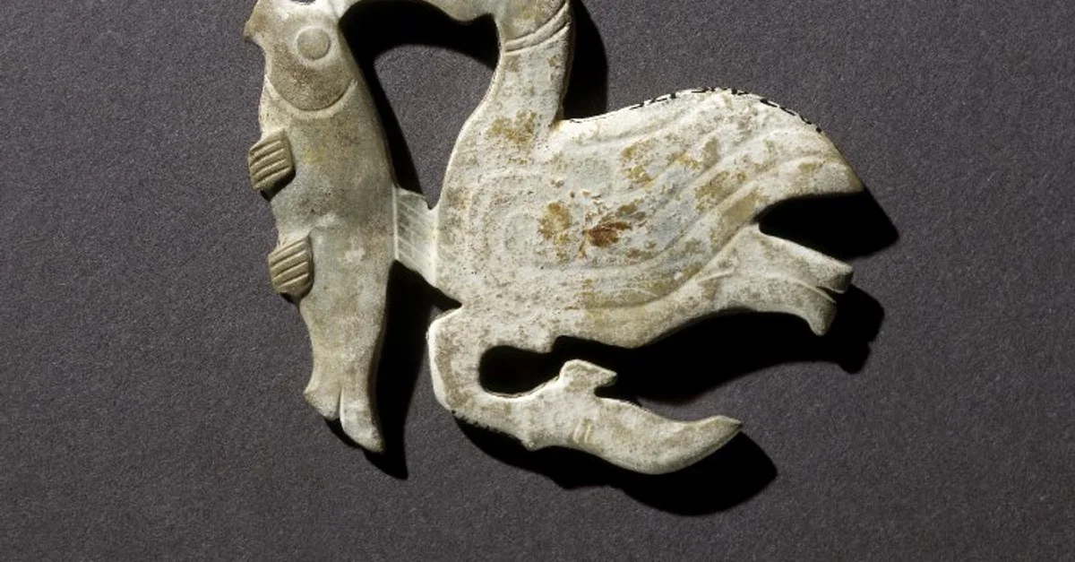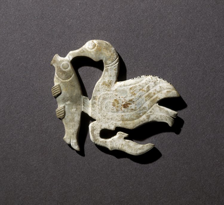A Chinese jade plaque of a cormorant and fish. 1100-900 BCE. Height: 4 cm. (British Museum, London)