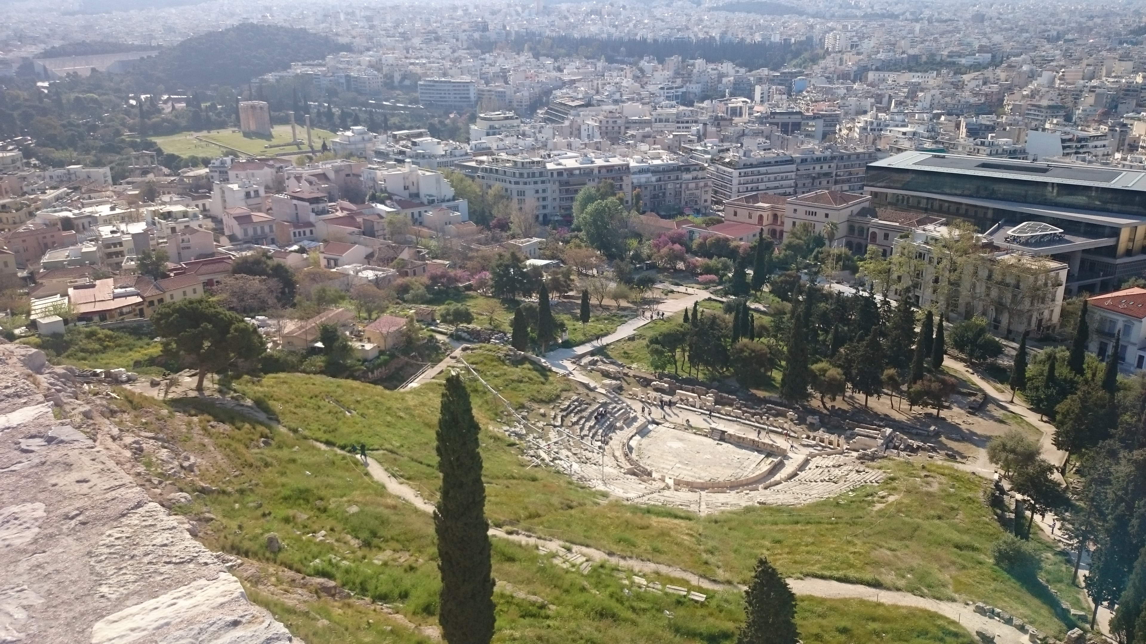 A few things are visible in this picture. The theatre of Dionysus Eleuthereus: Construction: 6th-4th century BCE The temple of Olympian Zeus to the left: Construction: 2nd century CE The Panathenaic Stadium to the far left: Construction: 6th century BCE The museum of the Acropolis is also visible to the right. Location: Athens, Greece