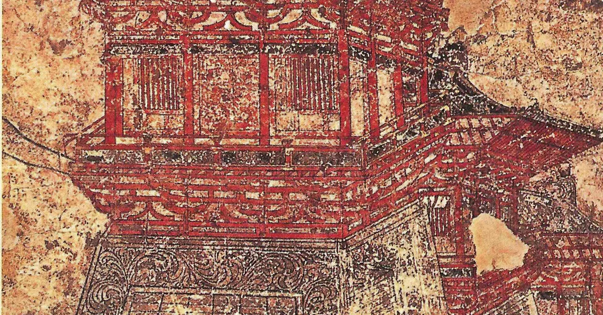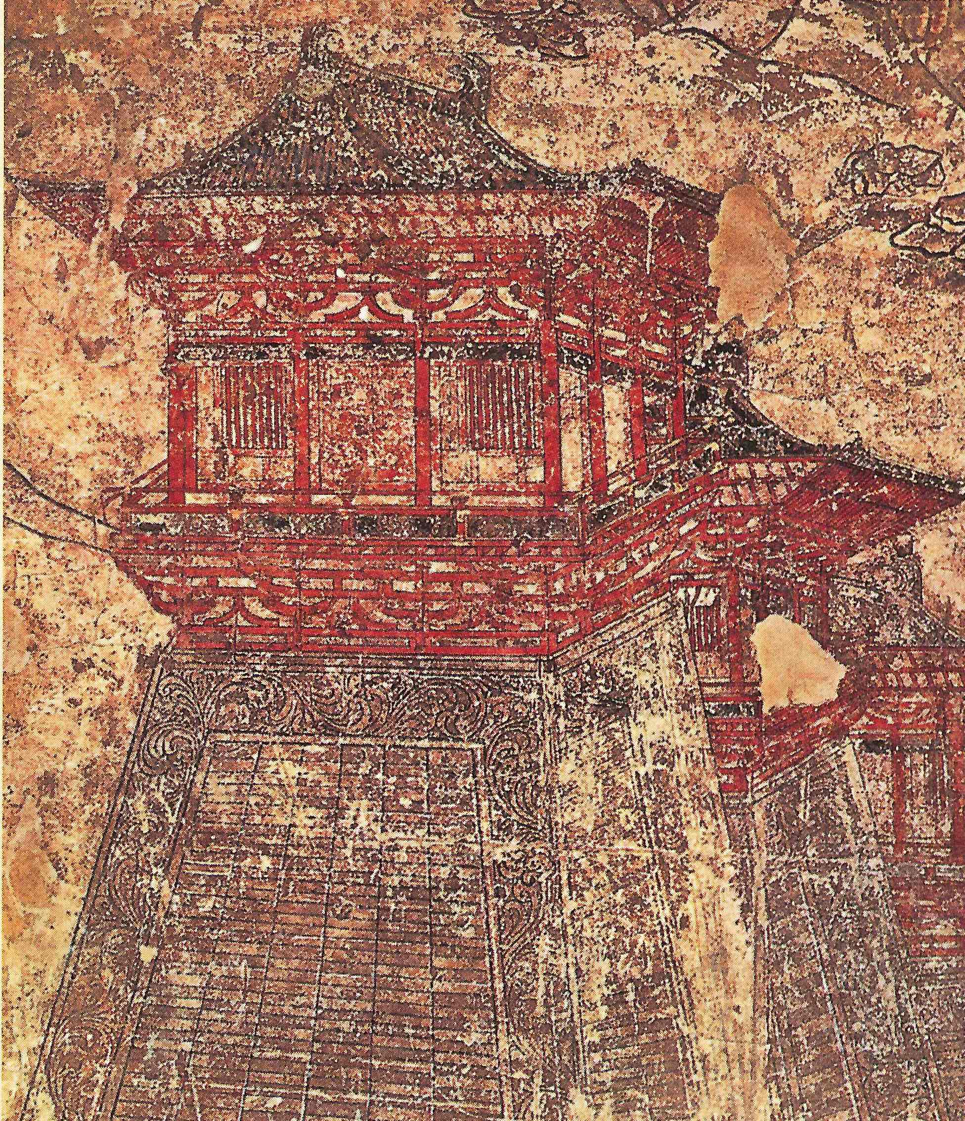A wall painting from Prince Yide's tomb, Xian, China, depicting a towered gate of Chang'an, capital of the Western Han and Tang Dynasties, amongst others. Tang Era (618-907 CE).