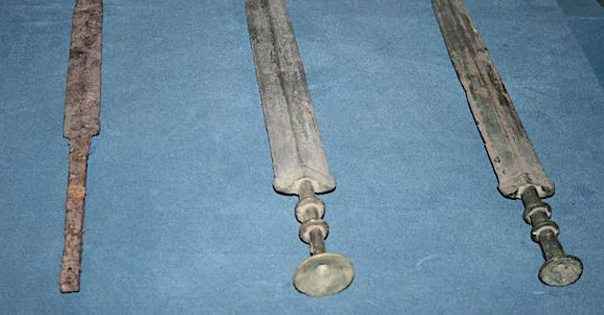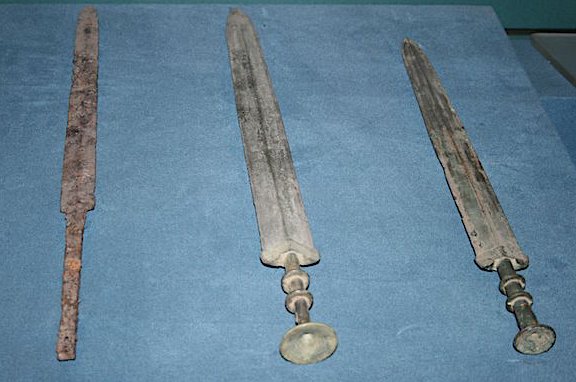 Swords of the Warring States Period (481-221 BCE) in China. The left sword is of iron while the other two are of bronze. (Shaanxi Provincial Museum, Xian, China)