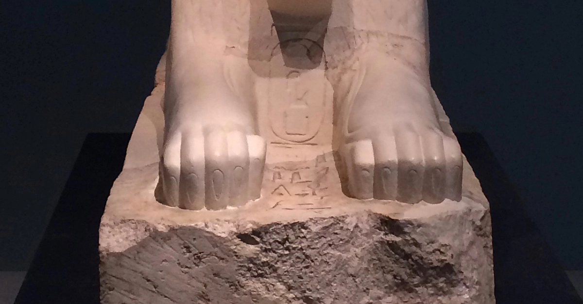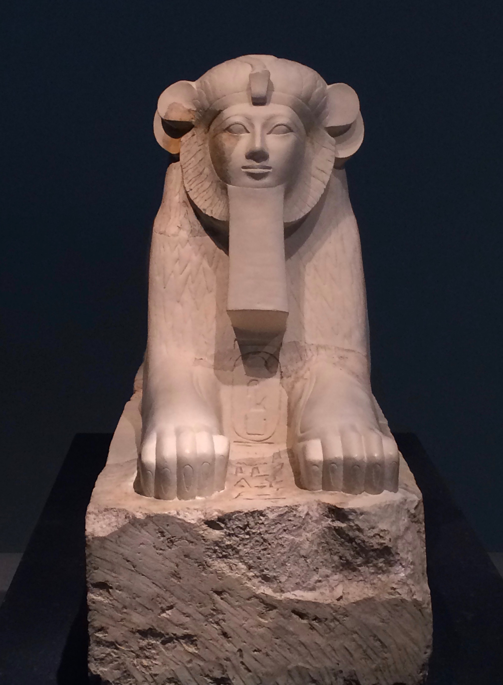 This limestone and plaster piece depicts the female pharaoh Maatkare Hatshepsut as a sphinx. She has the body and mane of a lion, with the head of a human. Carved between the paws of the statue is a cartouche enclosing the pharaoh's throne name, "Maatkare" ("Truth is the Soul of the Sun.) (c. 1479-1458 BCE, the Metropolitan Museum of Art, New York).