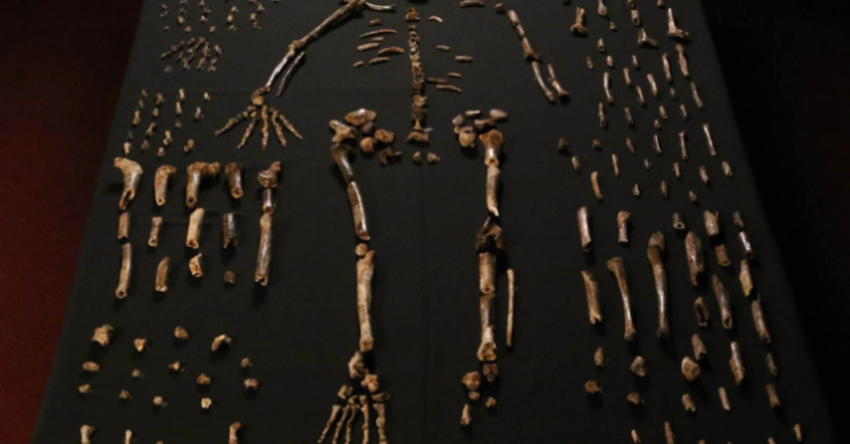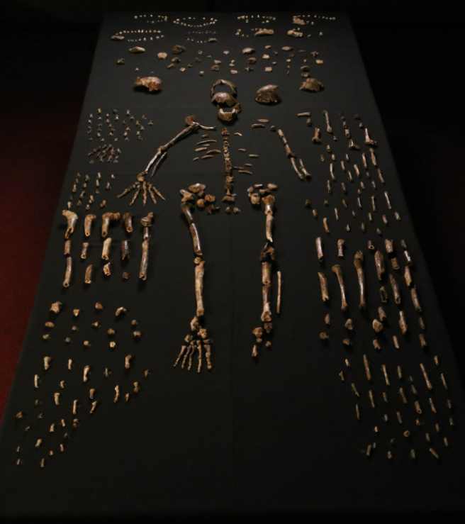 A composite skeleton that represents multiple individuals of Homo naledi, created from specimens found in the Dinaledi chamber in the Rising Star Cave, South Africa. The specimens have been dated to between 236,000 and 335,000 years old.