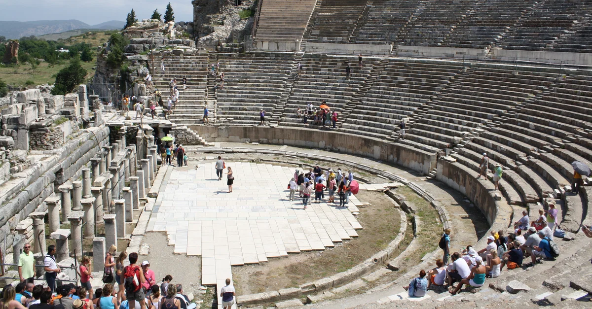 First constructed in the reign of Lysimachos (early 3rd century BCE), the theatre is built into a natural hill and construction evolved through Hellenistic and Roman times. The seated area (or cavea) was larger than a semi-circle and 38m in height, 154m in diameter. Two passages create three sections of seats reached by 12 stairways. The seating capacity may have reached 24,000.