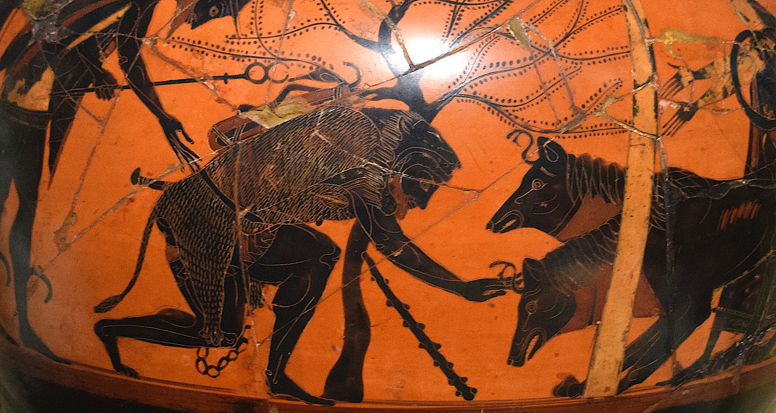 Hercules capturing Cerberus (Kerberos), the hound of Hades. Detail from an Attic black-figure amphora, c. 530 BCE.