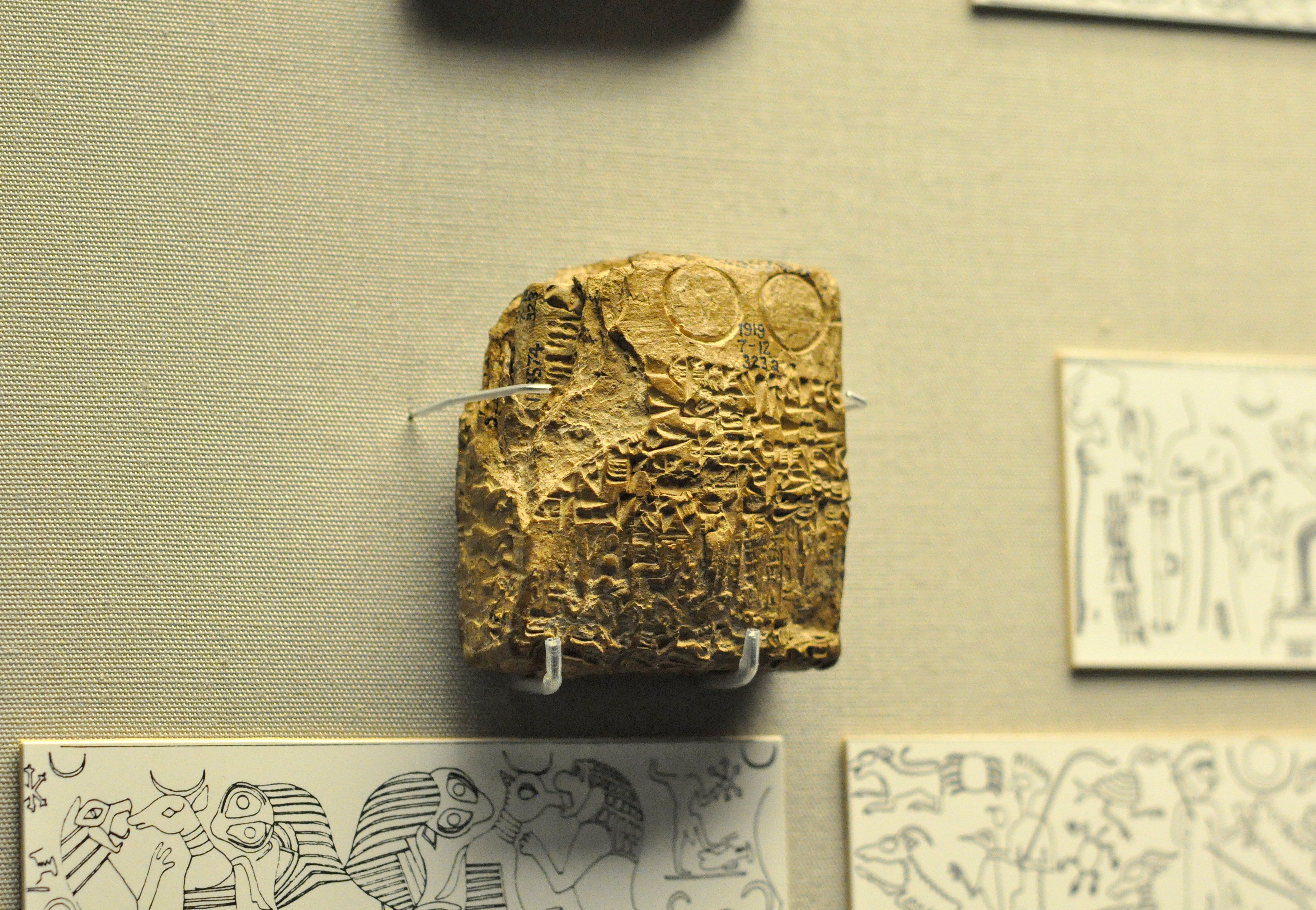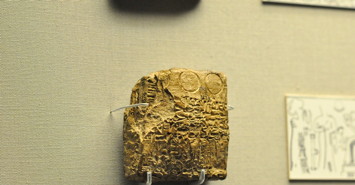 The cuneiform text on the center of this unopened envelop narrates a loan of silver to a husband and wife. The envelop is marked by rings and cylinder seals used by the diverse community at the city of Kultepe. There are 3 scenes; Babylonian, Assyrian, and Anatolian. The Babylonian scene shows a goddess and a worshiper approaching a seated king. The Assyrian scene depicts lions attacking bulls. The Anatolian scene reveals animals surrounding a man and a god. Old Assyrian Period, 1920-1740 BCE. From Kültepe (Kanesh), modern-day Turkey. (The British Museum, London).