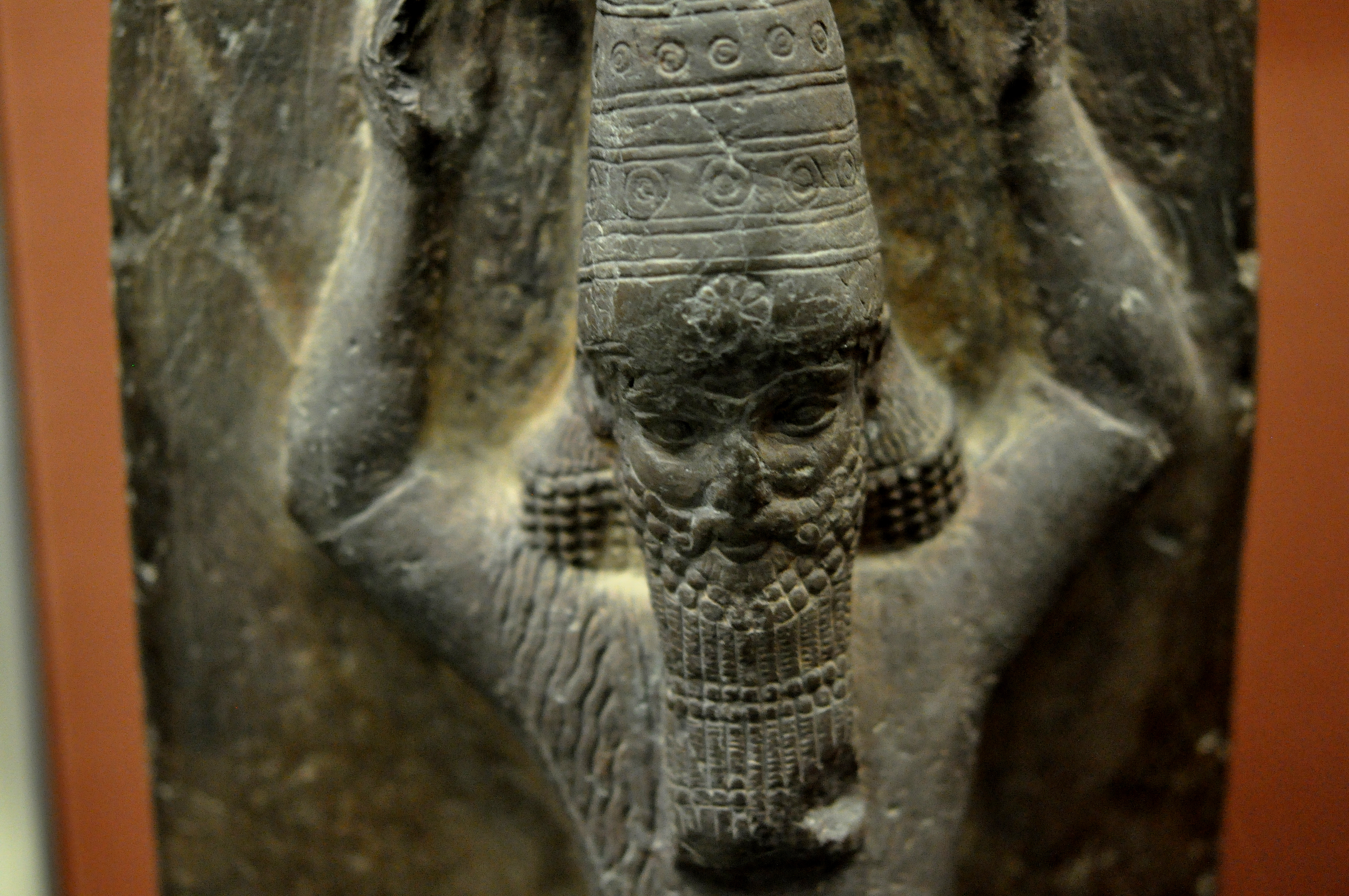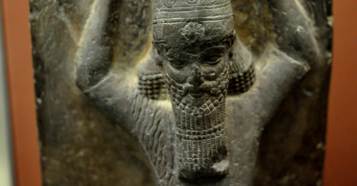 A close-up image of a red sandstone stela depicting the Assyrian King Ashurbanipal II. The king holds a ritual basket of earth on his head (not shown here) for the rebuilding of E-Zida temple. Neo-Assyrian Period, 668-655 BCE. From the temple of Nabu at Borsippa, Mesopotamia, modern-day Iraq. (The British Museum, London).