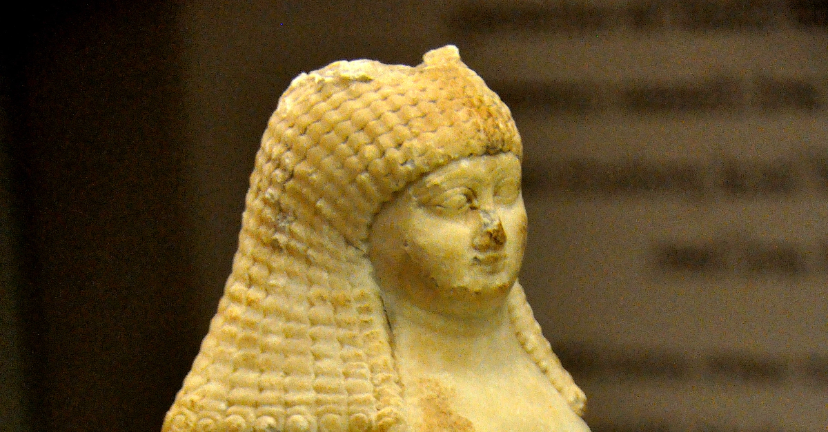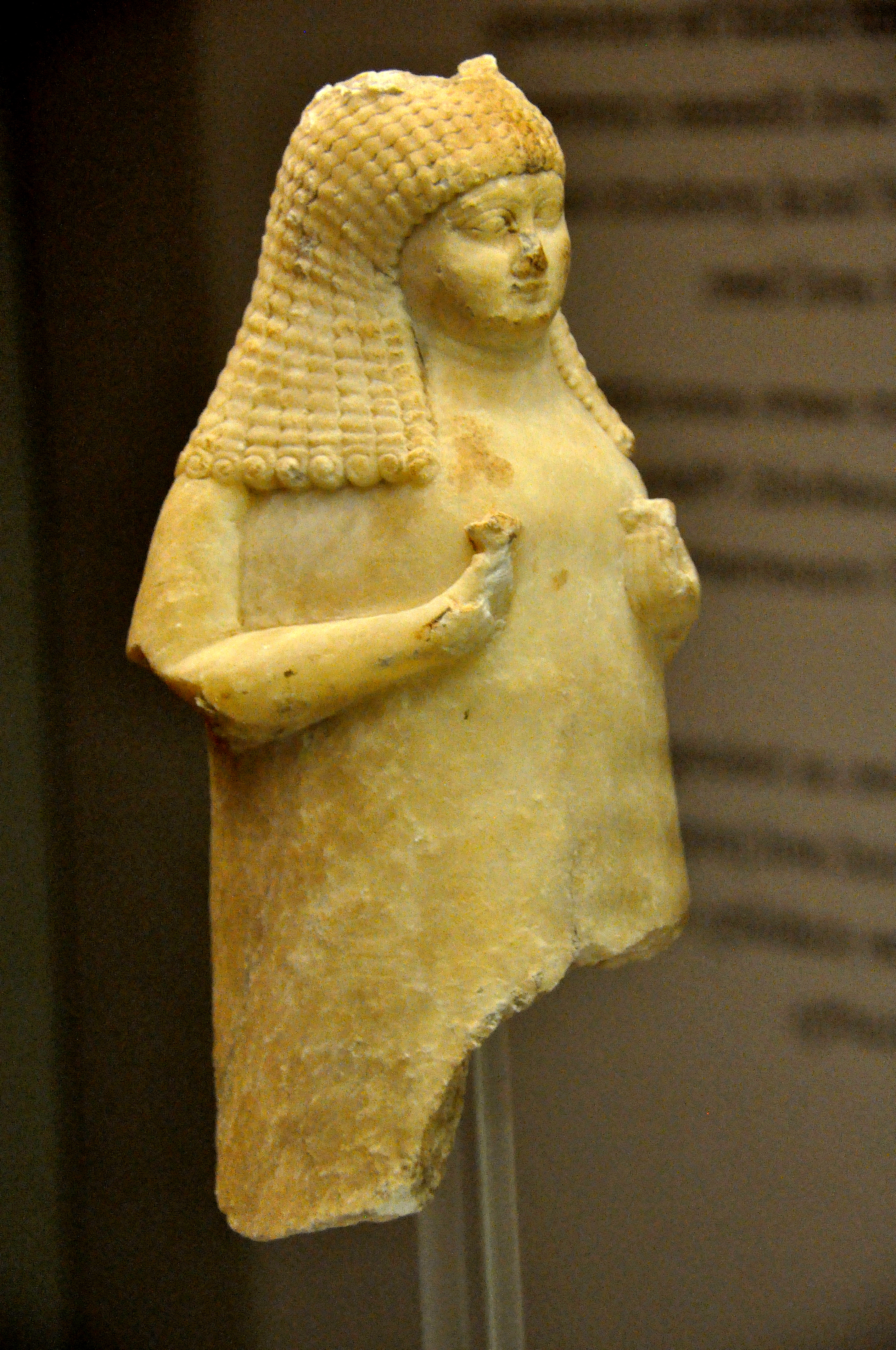 Alabaster vase in the shape of a standing woman with ample proportions. She has a sweeping hair and holds flowers. Late Babylonian Period, 700-600 BCE. From Sippar (modern-day Tell Abu Habbah), Mesopotamia, modern-day Iraq. (The British Museum, London)