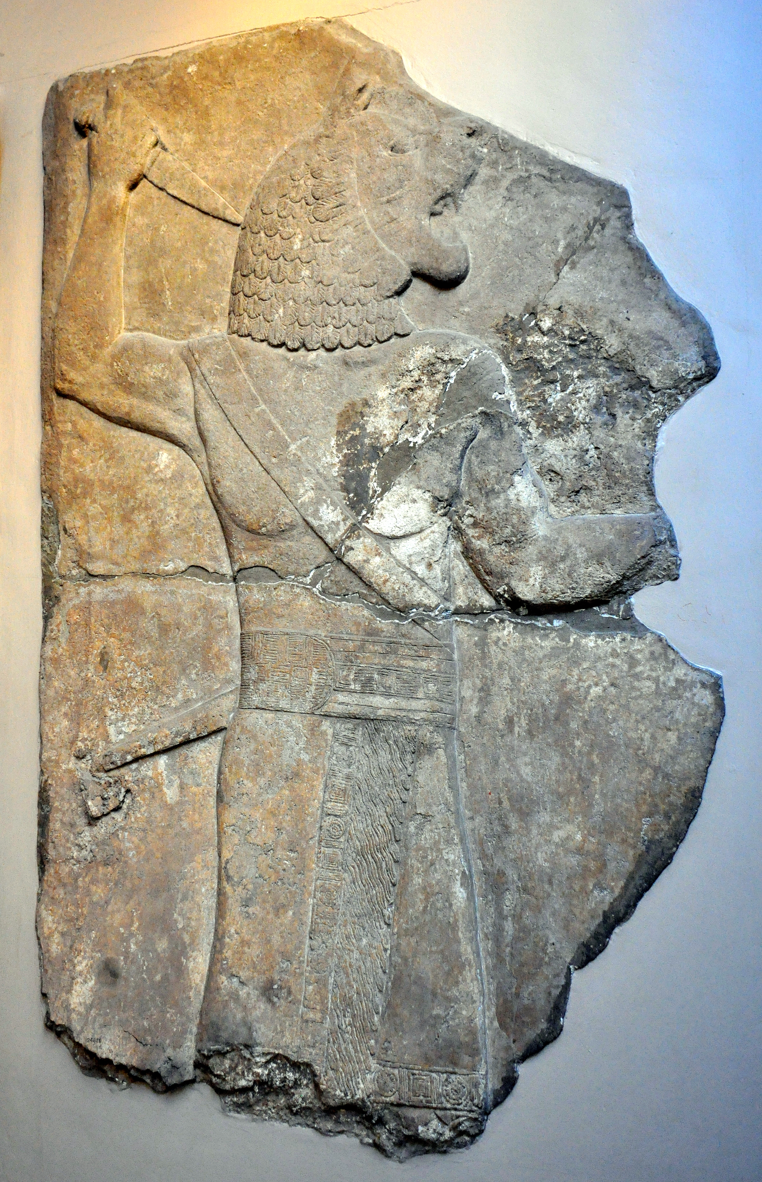 This gypsum wall relief depicts a standing lion-headed man holding a dagger, looking to the right. This is "the Great Lion" or "Ugallu". Layard found it in two fragments, among the so-called "Gallery XLIX (O); the long gallery" at the South-West Palace of Nineveh (Kouyunjik). Layard, to describe this wall panel, stated that "Amongst the scattered fragments was the figure of a lion-headed man raising a sword which does not appear to have belonged to this gallery, unless it had been used to break the monotony of one long line of elaborate bas-reliefs representing nearly the same subject. Similar figures only occur at entrances in the ruins of Kouyunjik". Neo-Assyrian Period, reign of Sennacherib, 700-692 BCE. From Mesopotamia, modern-day Iraq. (The British Museum, London)