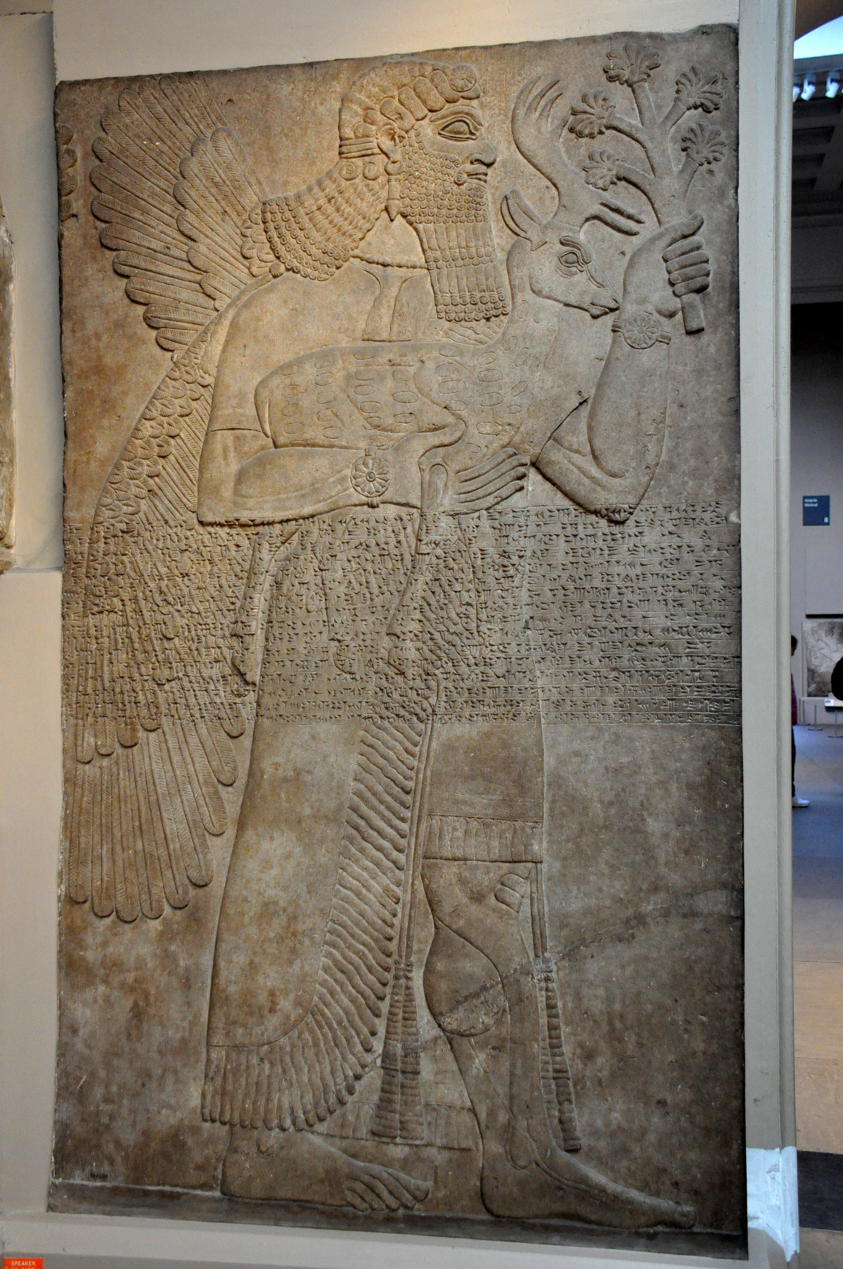 A human-headed and winged Apkallu, holding a deer in his right arm. The left hand carries a palm branch. The animal is a Persian fallow deer (of the species Dama Mesopotamica). This deer still lives in Northern and North-Eastern parts of Iraqi Kurdistan (in the area between Iraq, Iran, and Turkey, where the heartland of the Assyrian Empire is very close). The Apkallu wears a kilt and a fringed rope containing many tassels. He is bare-footed. Neo-Assyrian Period, reign of Ashurnasirpal II, 865-860 BCE. Panel 30 (right half), Room B of the North-West Palace at Nimrud (Kalhu), Mesopotamia, modern-day Iraq. This room’s door leads to the Royal Throne Room. (British Museum, London)