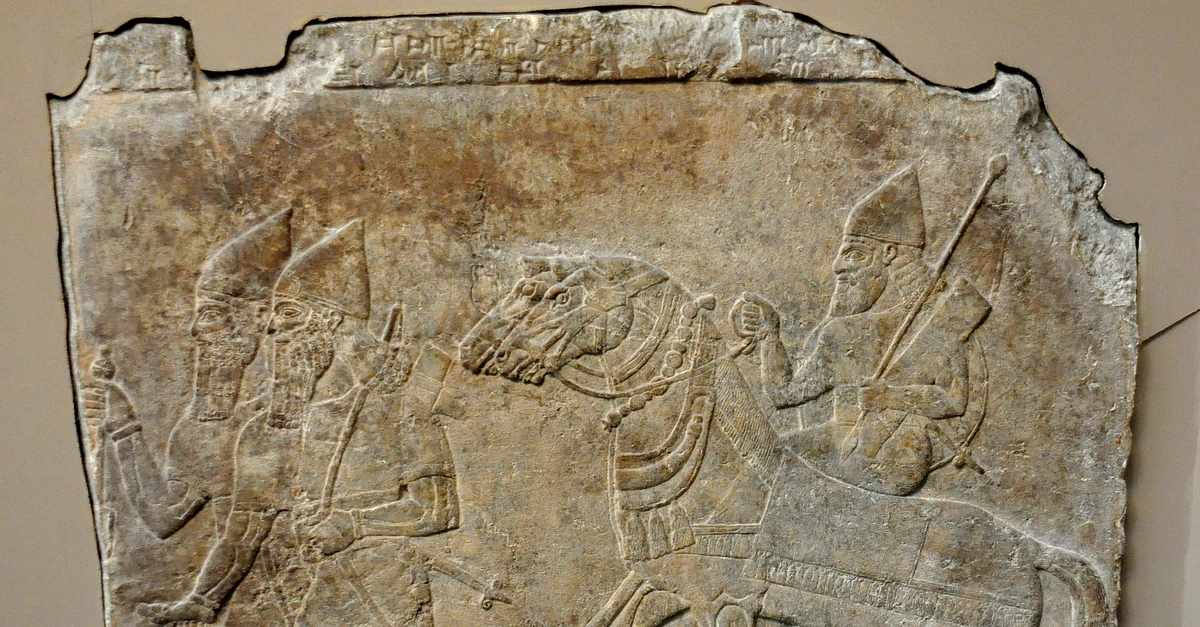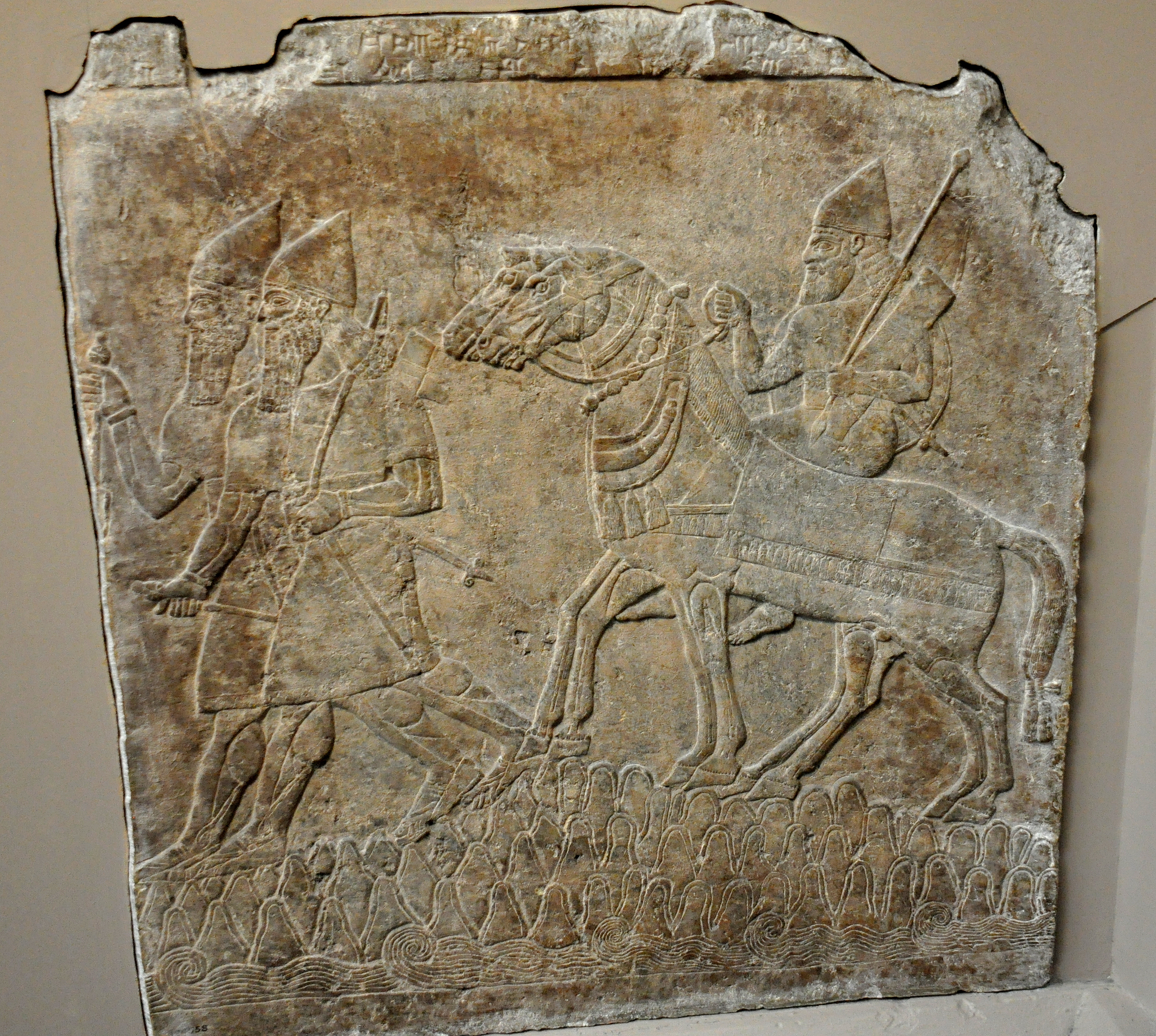 This gypsum wall relief was part of a corner panel. It depicts Assyrian soldiers with horses crossing a mountainous area. The wavy lines and spirals at the bottom of the scene represent a river. The cuneiform inscriptions on the reverse refer to a military campaign in modern-day Lebanon. Neo-Assyrian Period, reign of Ashurnasirpal II, circa 874 BCE. From the north-west corner of Room WG, the North-West Palace, Nimrud (Kalhu), Mesopotamia, modern-day Iraq. (The British Museum, London)