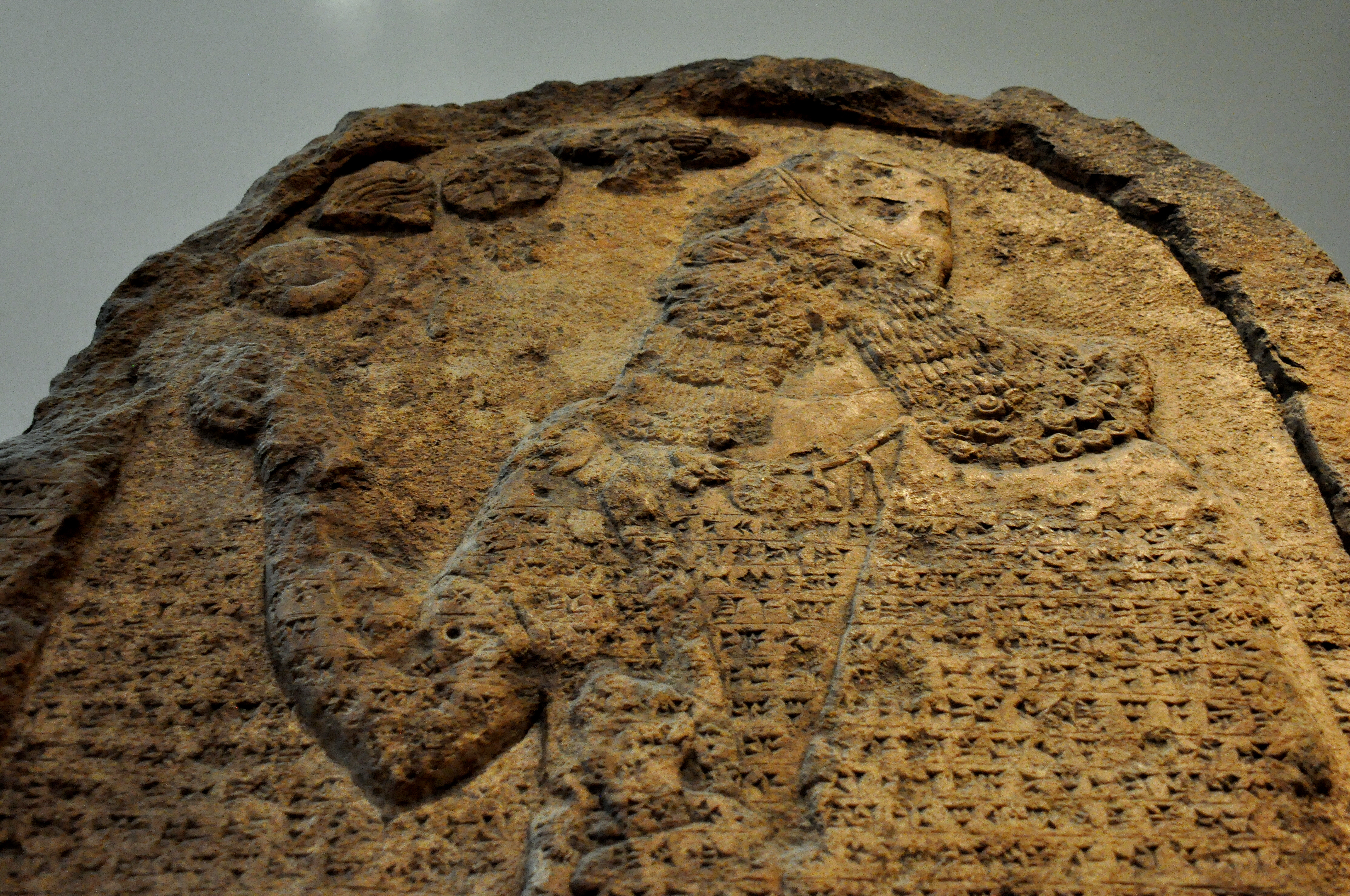 This is a close-up view of the upper part of the stela, depicting Shalmaneser III praying in front of divine symbols (Ashur, Ishtar, Anu, and Sin). The cuneiform inscription is a text of a version of the King's annals and narrates his campaign in chronological order, concluding with a description of the battle of Qarqar in 853 BCE against a large coalition led by the kings of Damascus and Hamath. Neo-Assyrian Period, reign of Shalmaneser III, circa 852 BCE. From Kurkh, Diyarbakir, modern-day Turkey. (The British Museum, London).