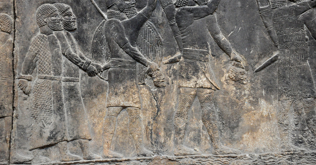 The Assyrian army of Sennacherib captured the city of -alammu. This gypsum wall relief depicts Assyrian soldiers carrying the beheaded heads of their defeated enemy. Prisoners are being reviewed by Sennacherib (who stands in his royal chariot, not shown here). The name of the city was inscribed completely, but only the last part of the city's name, -alammu, survives. The city probably lies in modern-day Turkey or Iran. Neo-Assyrian Period, reign of Sennacherib, 700-692 BCE. Room XIV, the South-West Palace at Nineveh, Mesopotamia, modern-day Iraq. (The British Museum, London).
