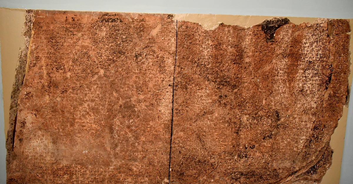 This is the beginning of a cuneiform inscription, which was carved on the pair of human-headed and winged bulls flanking the main entrance to the throne room of King Sennacherib. This inscription is from the area under the stomach of the bull (lamassu). It includes the most detailed surviving account on the tribute sent by Hezekiah, King of Juda, after the Assyrian military campaign to Palestine in 701 BCE. From Courtyard H, door "a", the South-West Palace at Nineveh, Northern Mesopotamia, modern-day Iraq. (British Museum in London)