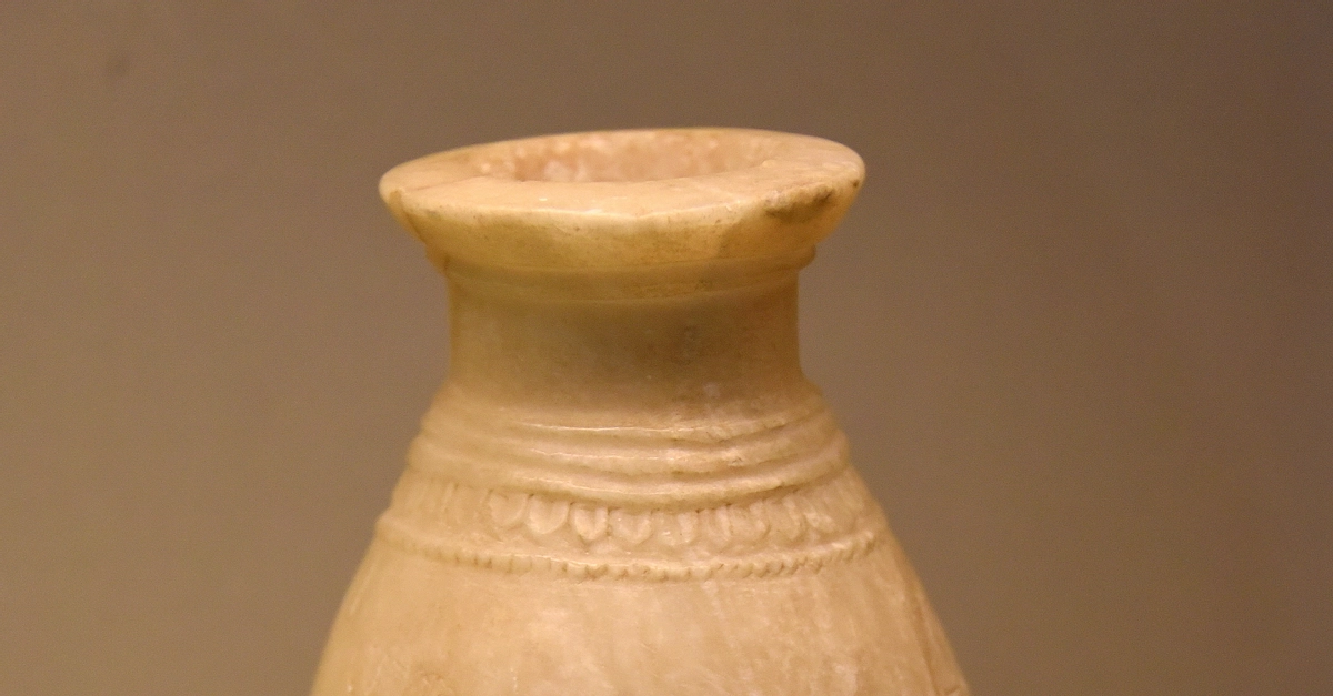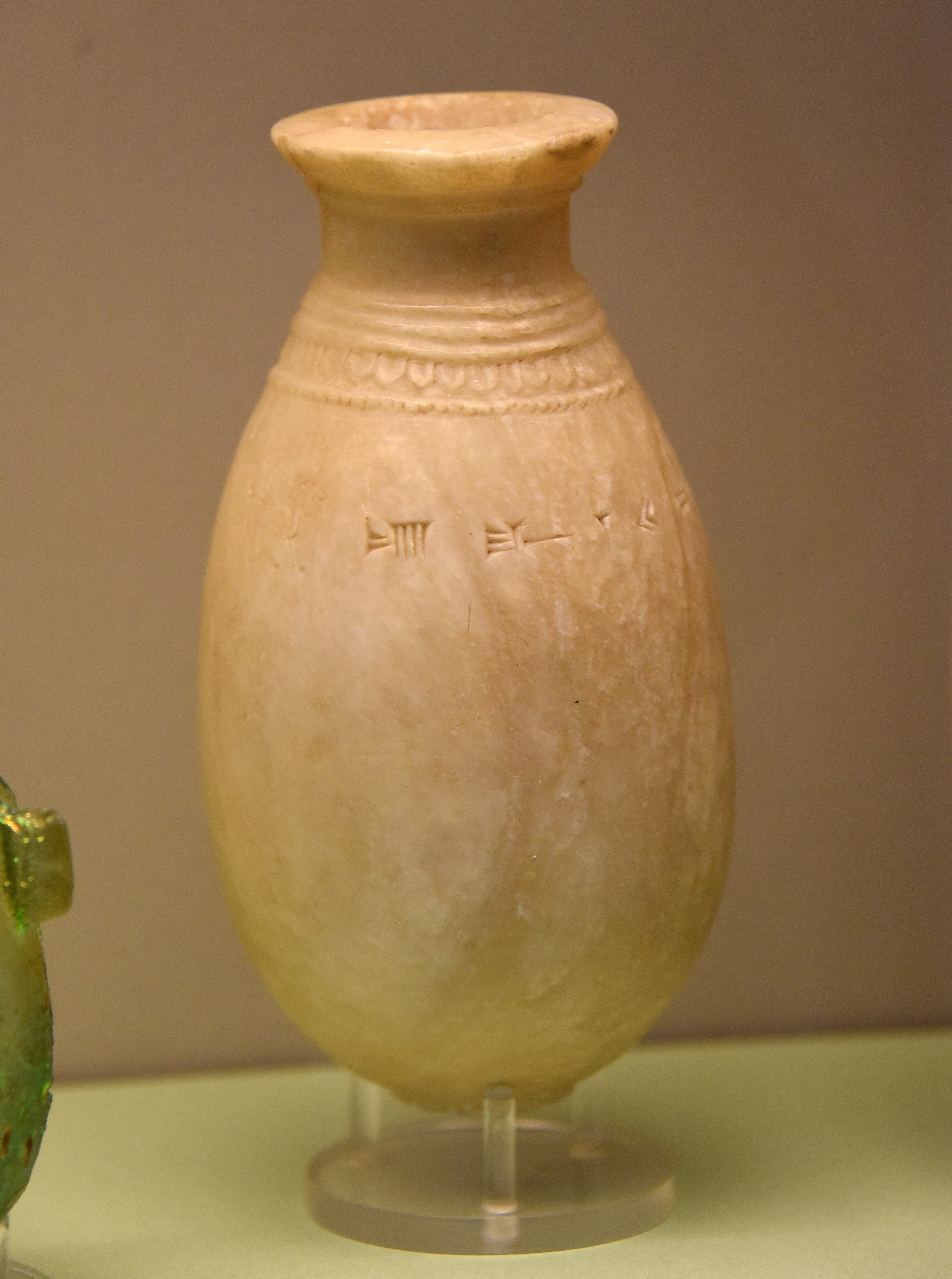 The cuneiform inscription on this alabaster vessel mentions that it belongs to king Sargon II. Neo-Assyrian Period, reign of Sargon II, 721-705 BCE. From the North-West Palace at Nimrud, Northern Mesopotamia, modern-day Iraq. (British Museum, London)