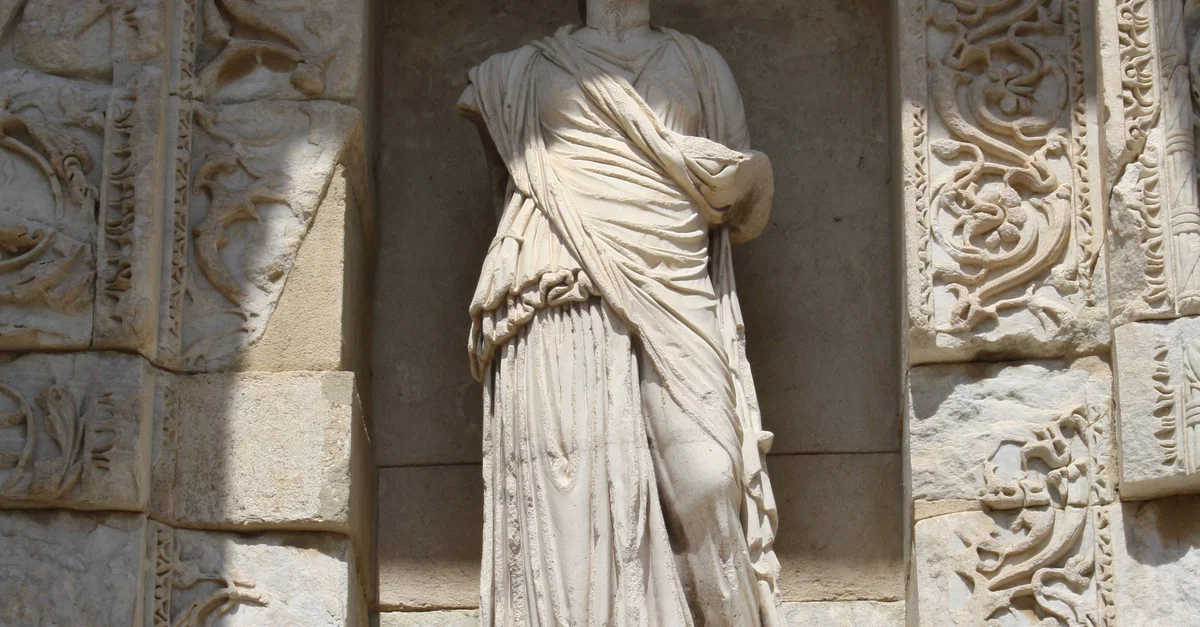 A detail of the facade of the Celsus Library in Ephesos (c. 117 CE). The statue represents wisdom (sophia), an attribute associated with the former proconsul Celsus to whom the building was dedicated.