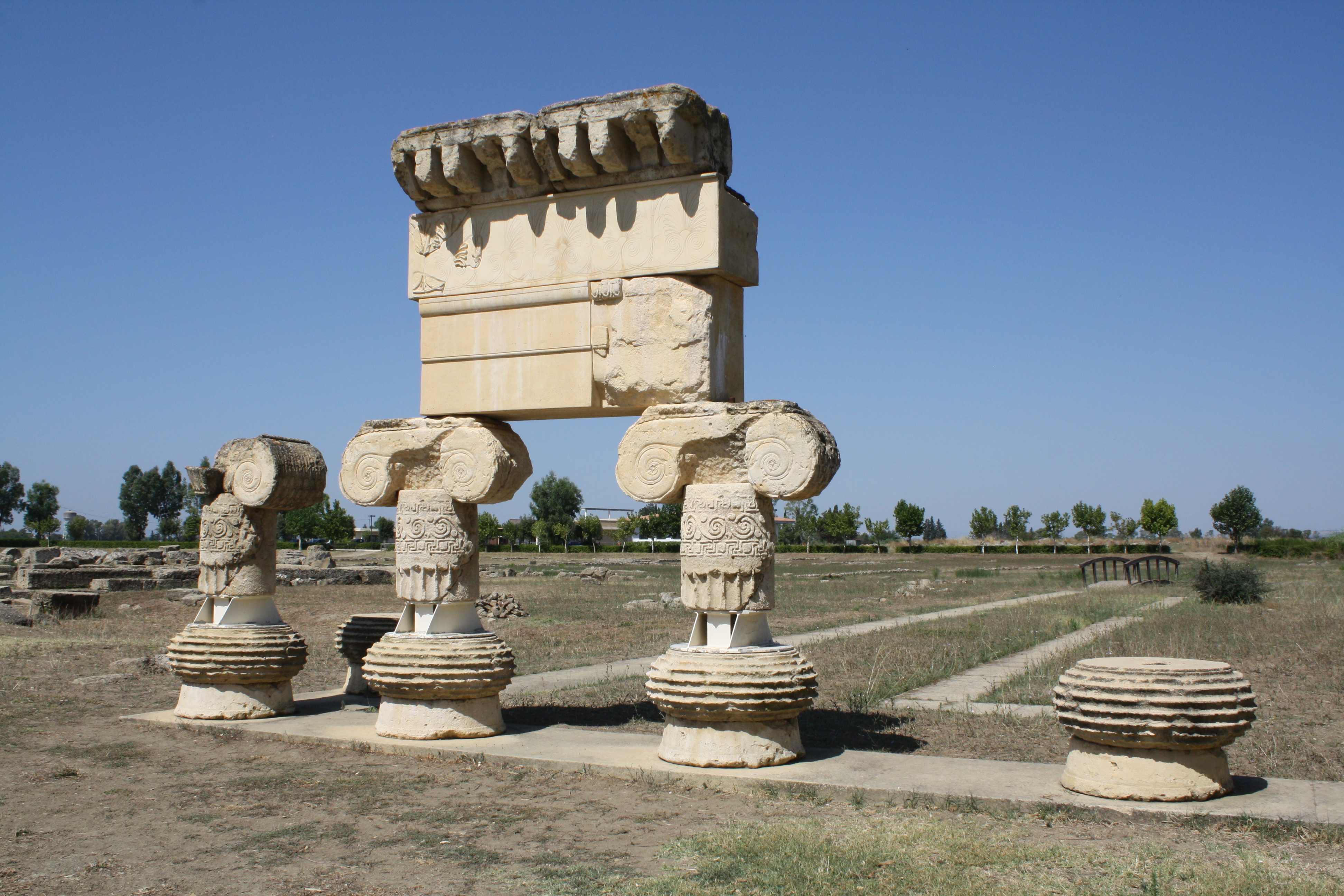 Ionic capitals and architrave from a temple of unknown dedication at Metapontum, Magna Graecia, southern Italy. 480-470 BCE.
