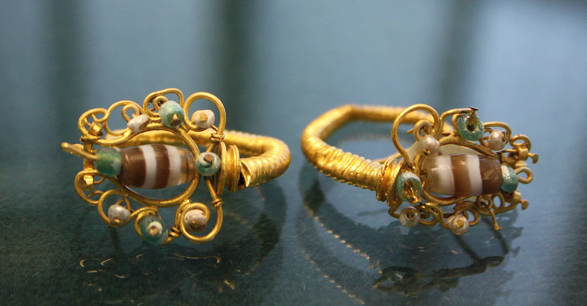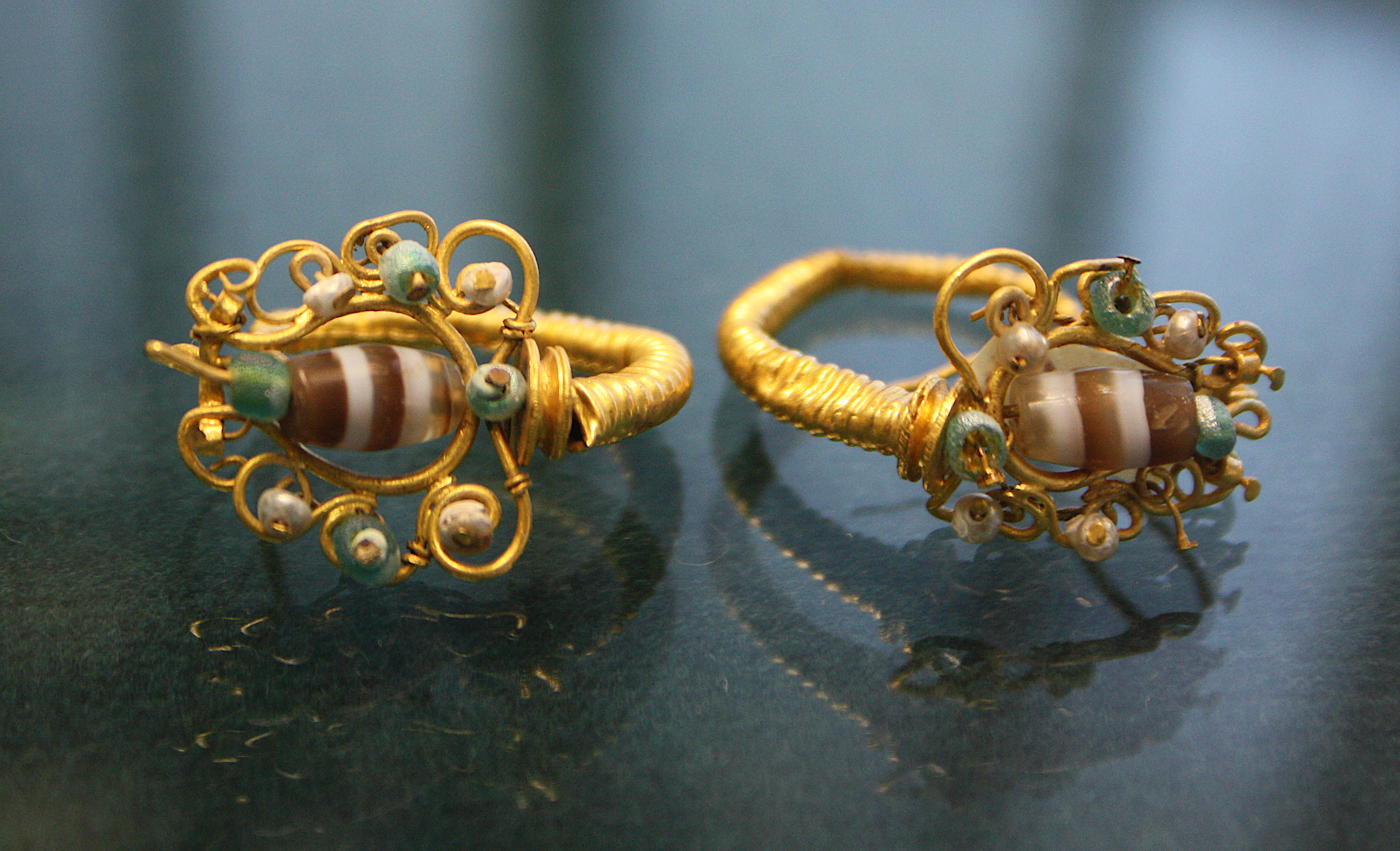 Gold and glass paste earrings. Acropolis of Herakleia, southern Italy. 1st century BCE. (Archaeological Museum of Siritide, Policoro, Italy)