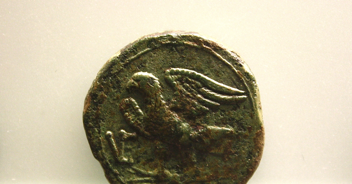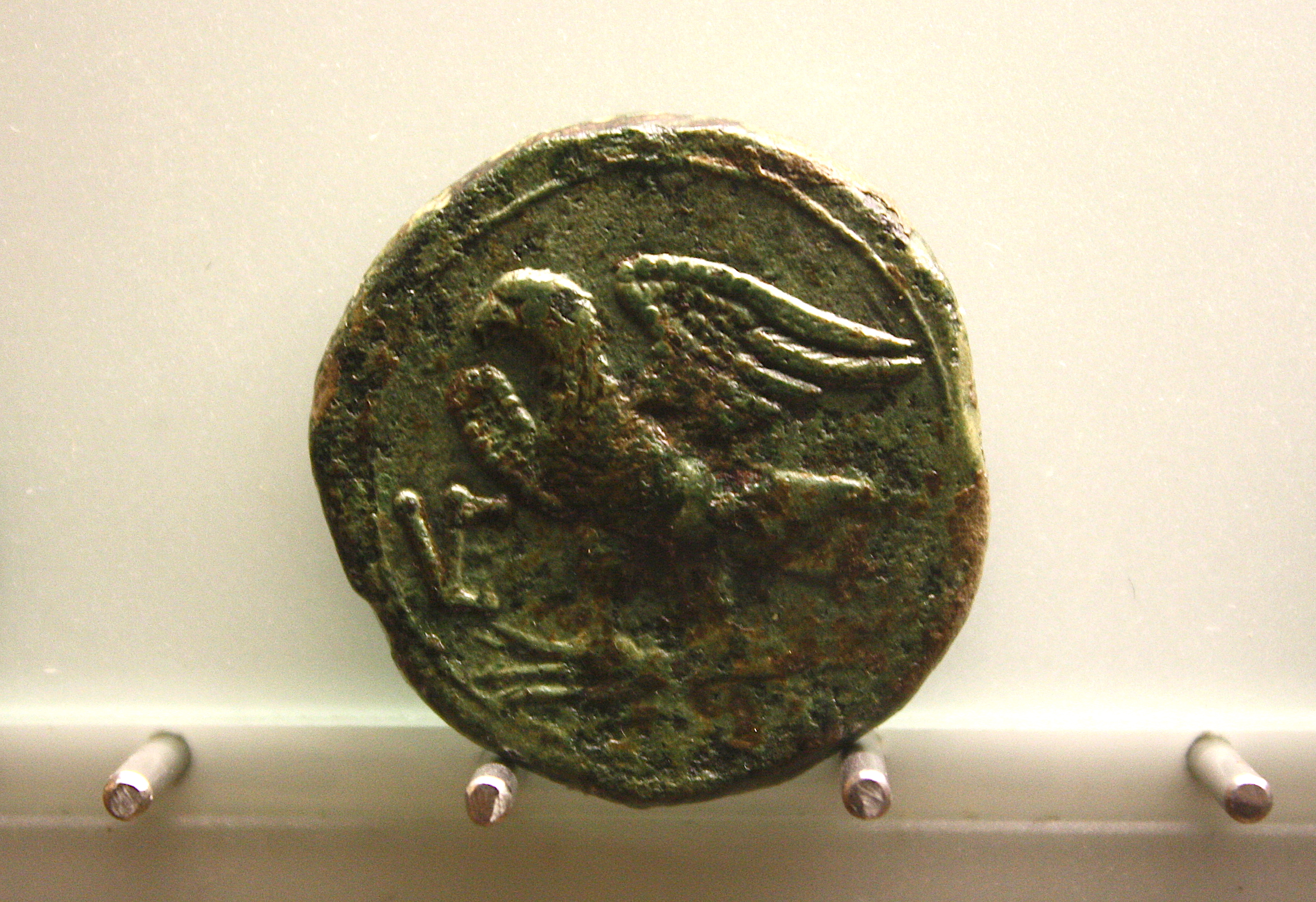 A Roman bronze coin of Venusia (modern Venosa), southern Italy. Eagle grasping three arrows and VE inscription. (Archaeological Museum of Venosa, Italy)