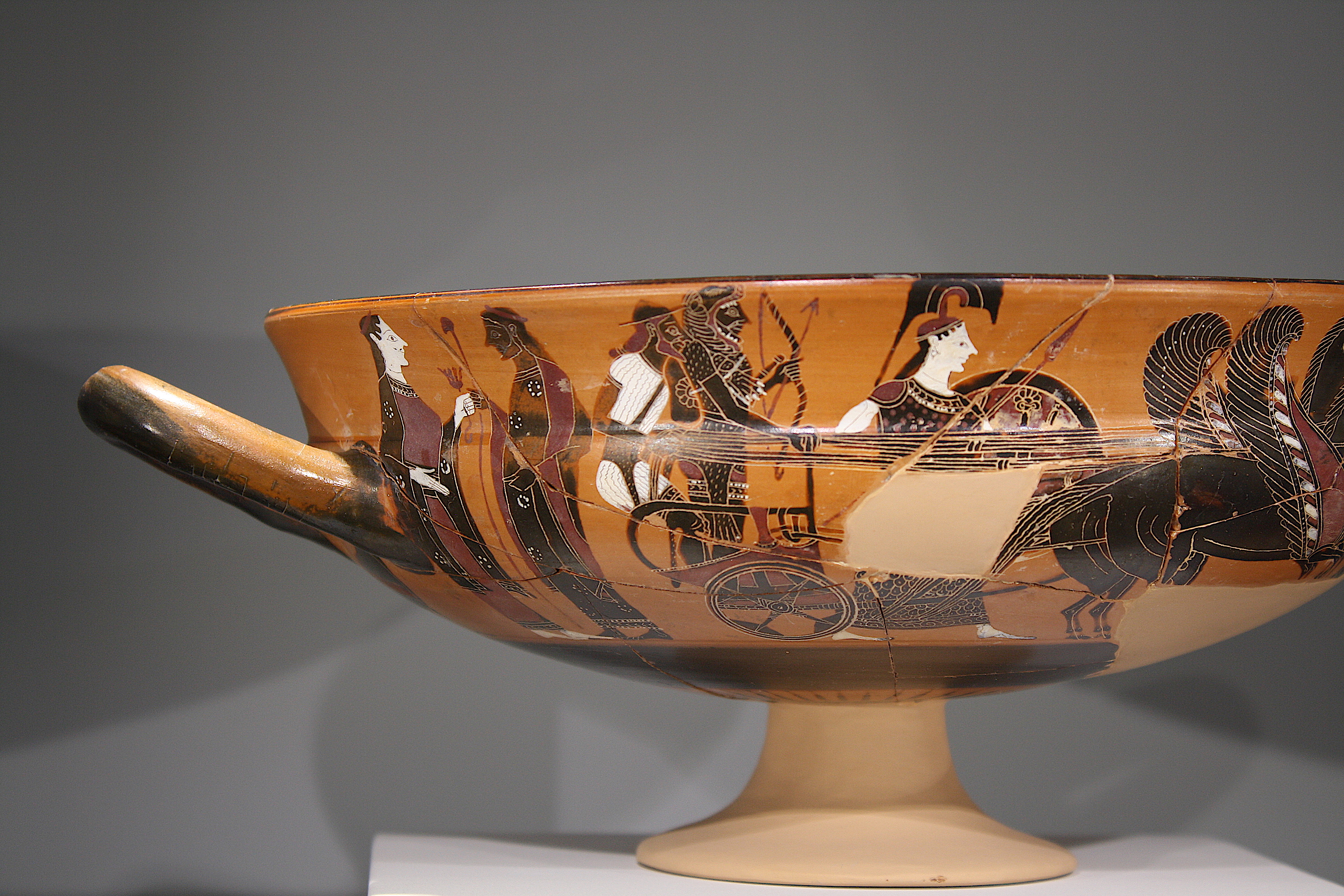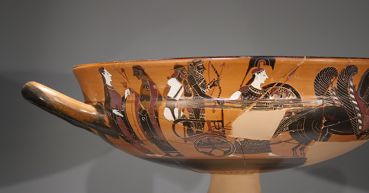 A black-figure kylix (drinking cup) depicting Hercules being driven in a chariot by Hermes. Athena is to the right. Tarentum, southern Italy, 550-520 BCE. (National Archaeological Museum, Taranto, Italy)