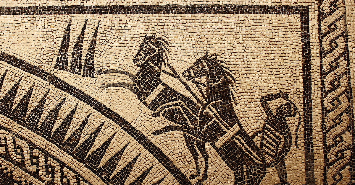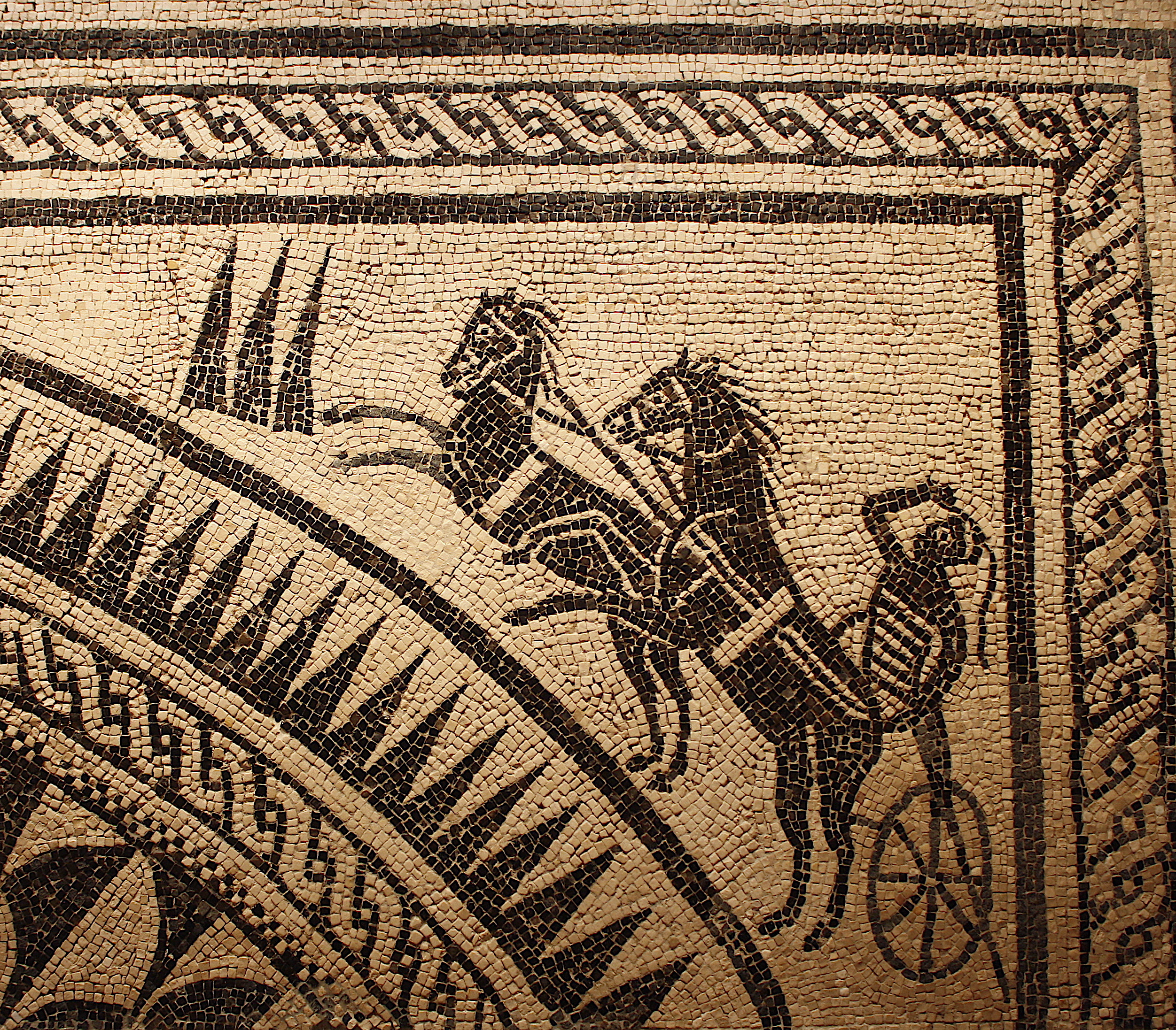 A detail from a floor mosaic depicting a chariot racer, Tarentum, southern Italy, Late 2nd century CE. (National Archaeological Museum of Taranto, Italy)