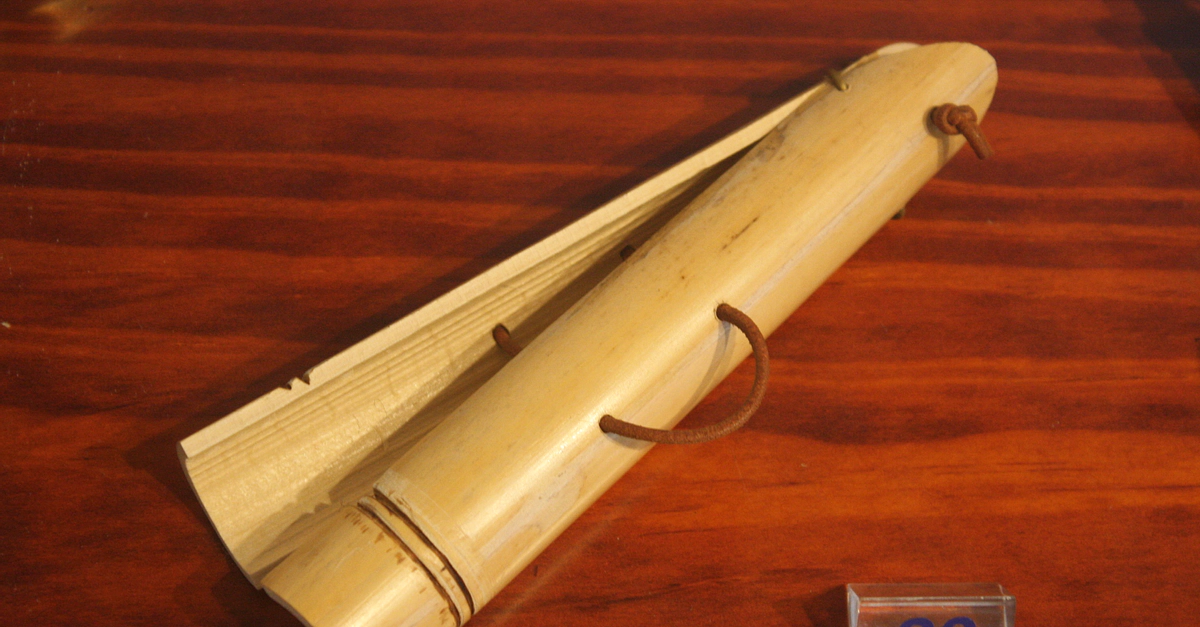 A reconstruction of the clapper (Krotala), an ancient percussion instrument made from cane, shell, wood or metal. Usually held in each hand with thumbs and middle finger through the leather loops for stability, they were played much like Spanish castanets. Played to keep tempo, they usually accompanied choruses in festivals and theatre performances.(Museum of Ancient Greek Musical Instruments, Katakolon, Greece).