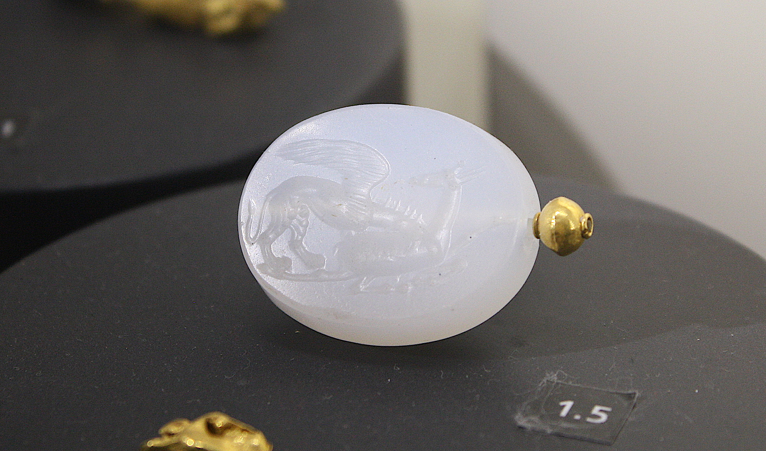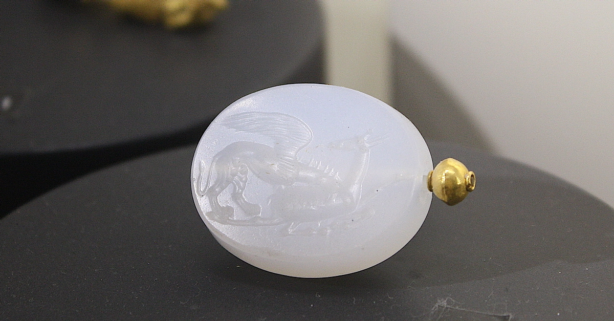 A chalcedony and gold seal depicting a griffin attacking a fawn. Tarentum, southern Italy. 300-275 BCE. (National Archaeological Museum of Taranto, Italy)