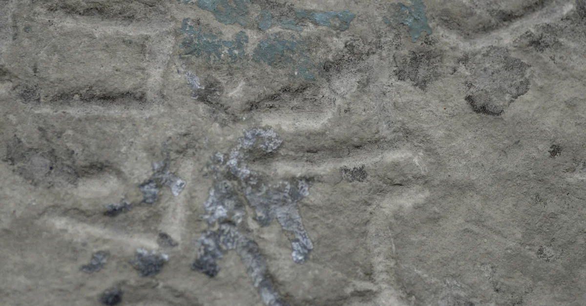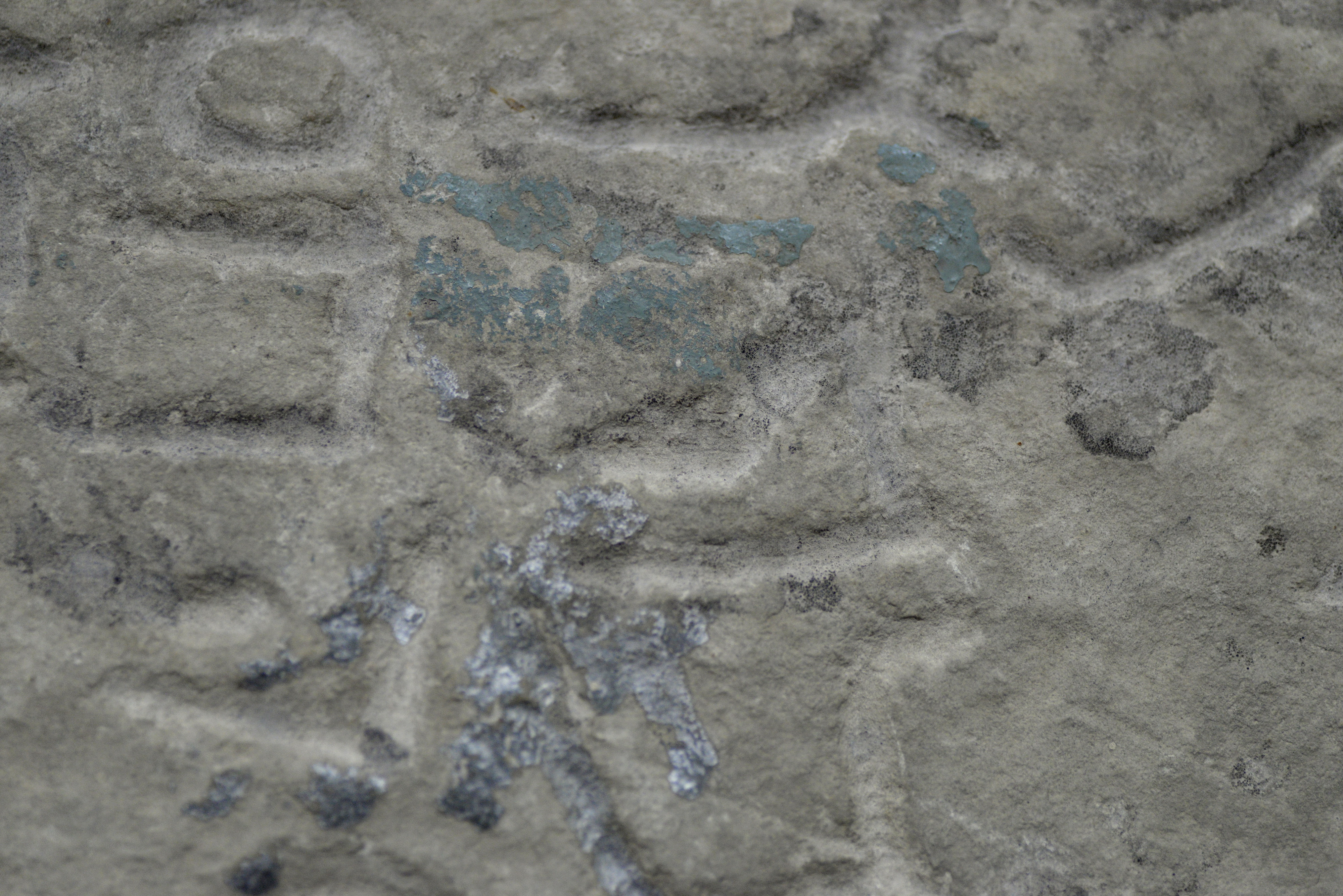 This rock is an inscribed tombstone of a deceased Jewish woman. The inscriptions are in Hebrew. Her name was "Siporah daughter of Dan". This is a close-up view. The surface of the rock has not undergone any conservation work. There is two modern paints, bluish-green and silver. This suggests that the rock was used for a certain purpose during the decades before its delivery to the Museum. The date on the tombstone is 1356/1357 CE. From Gopala village, Bazian (Baziyan), Sulaymaniyah Governorate, Iraq. It is currently housed in the Sulaymaniyah Museum, Iraqi Kurdistan.