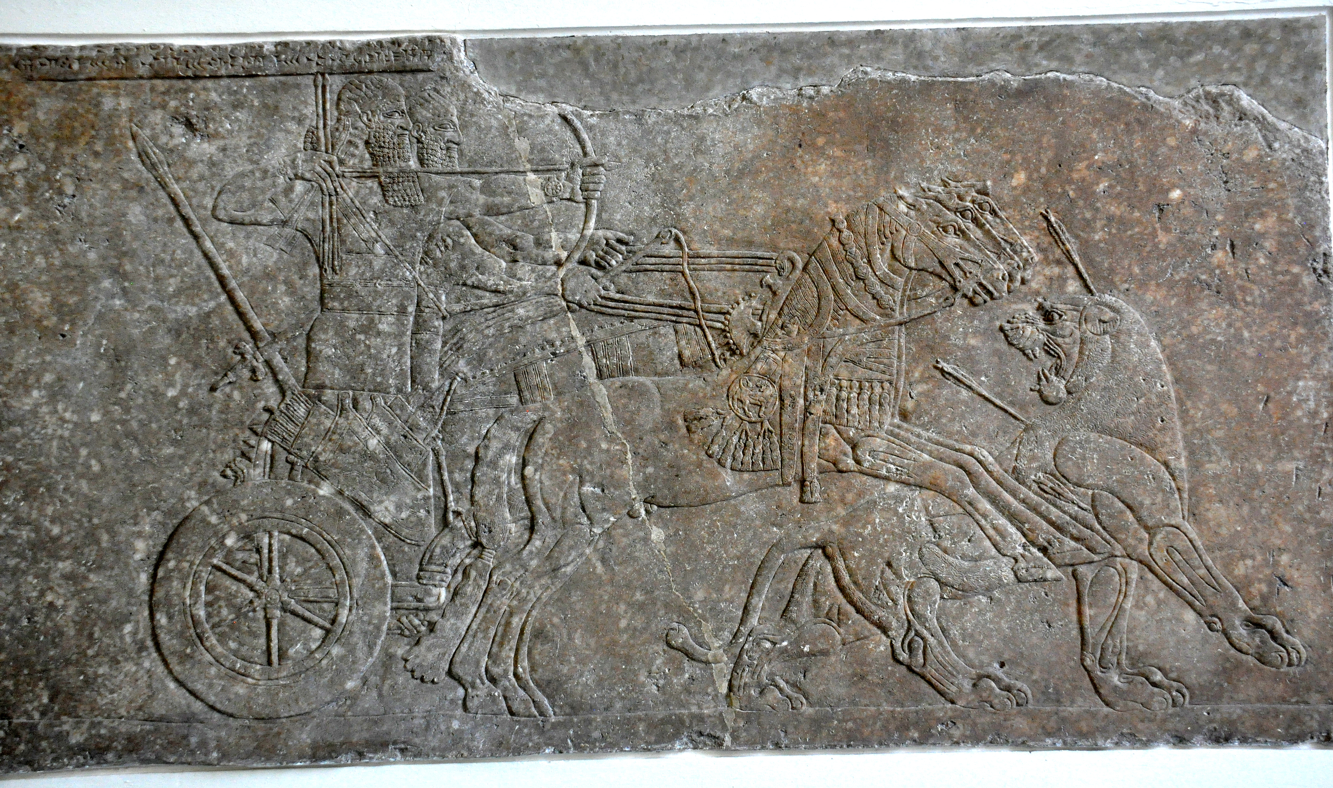 Gypsum wall relief depicting a classical Assyrian lion-hunting scene. The striking feature is that the king wears a diadem with a rosette on it, instead of the typical conical headcap of the Assyrian kings. From the North-West Palace at Nimrud, Mesopotamia, modern-day Iraq. Neo-Assyrian Empire, 9th century BCE.