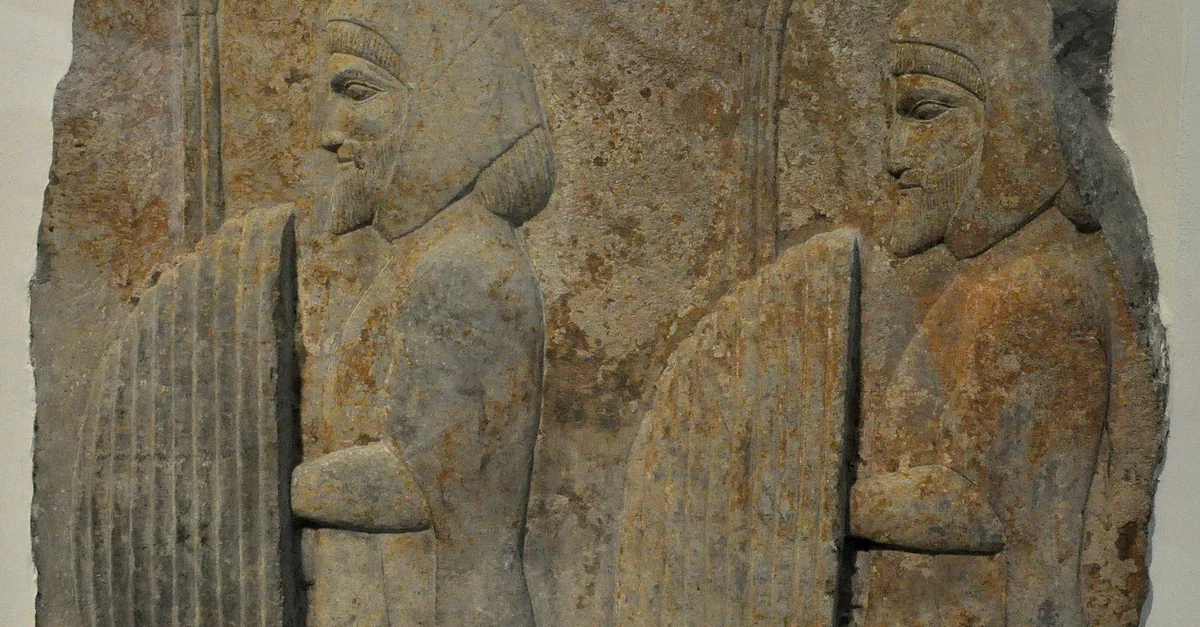 Limestone wall relief showing two men carrying shields and spears. Their distinctive costume identifies them as members of an entourage from the Land of Skudra (Thrace). From Persepolis, the Palace Terrace of Darius I (521-486 BCE), modern-day Iran.