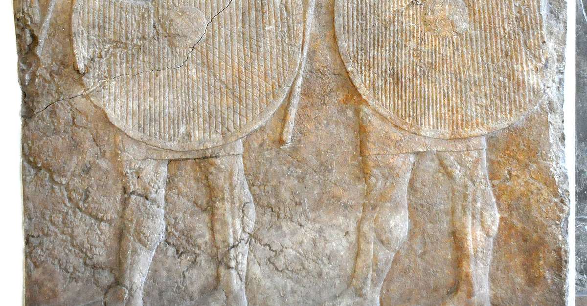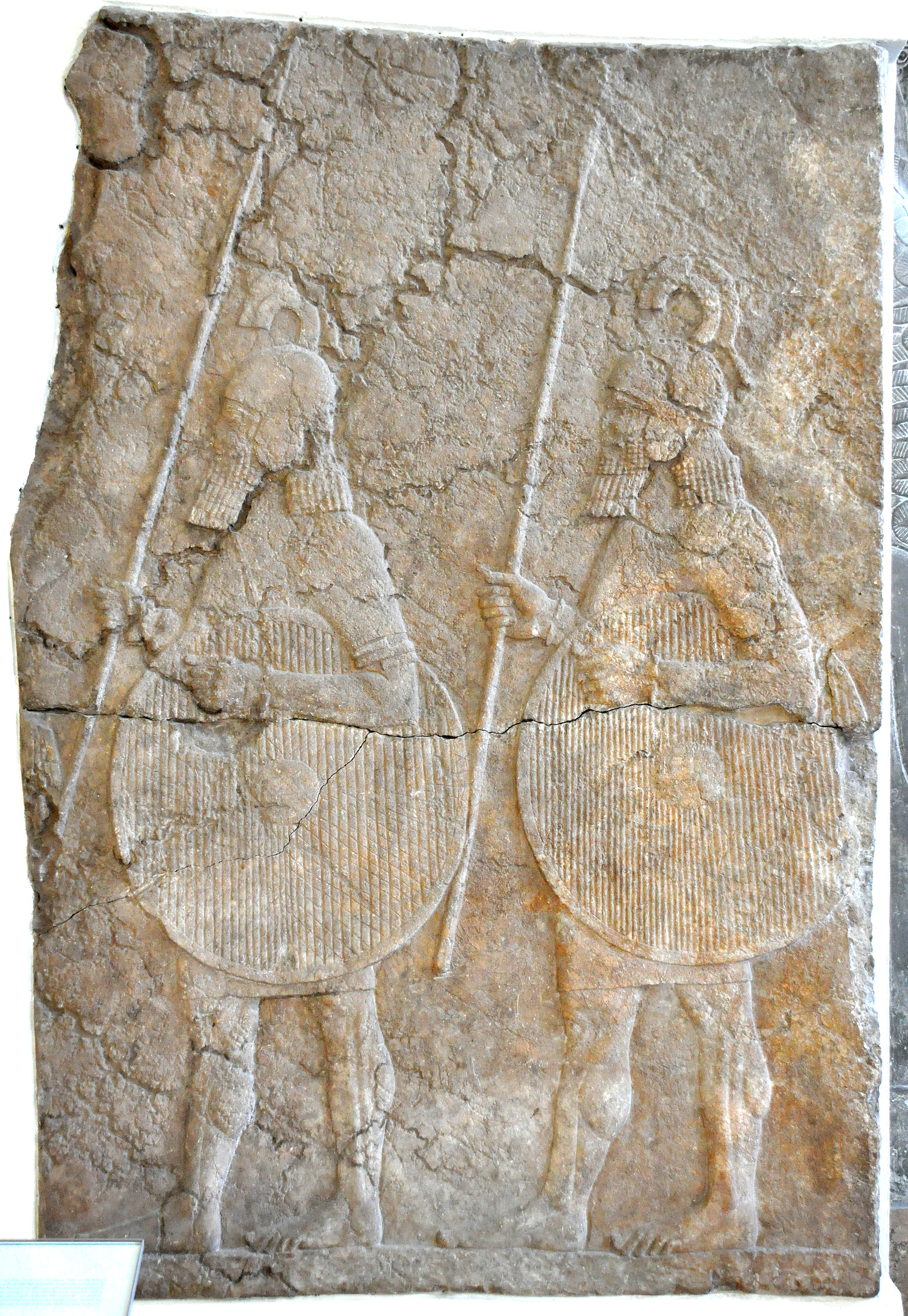 This gypsum wall panel depicts two bare-footed Assyria soldiers marching to the left. The bent tip on their helmets identify them as mercenaries. Neo-Assyrian Period, reign of Sennacherib, 704-680 BCE. From the South-West Palace at Nineveh, Mesopotamia, modern-day Iraq. (Pergamon Museum, Berlin. Germany)