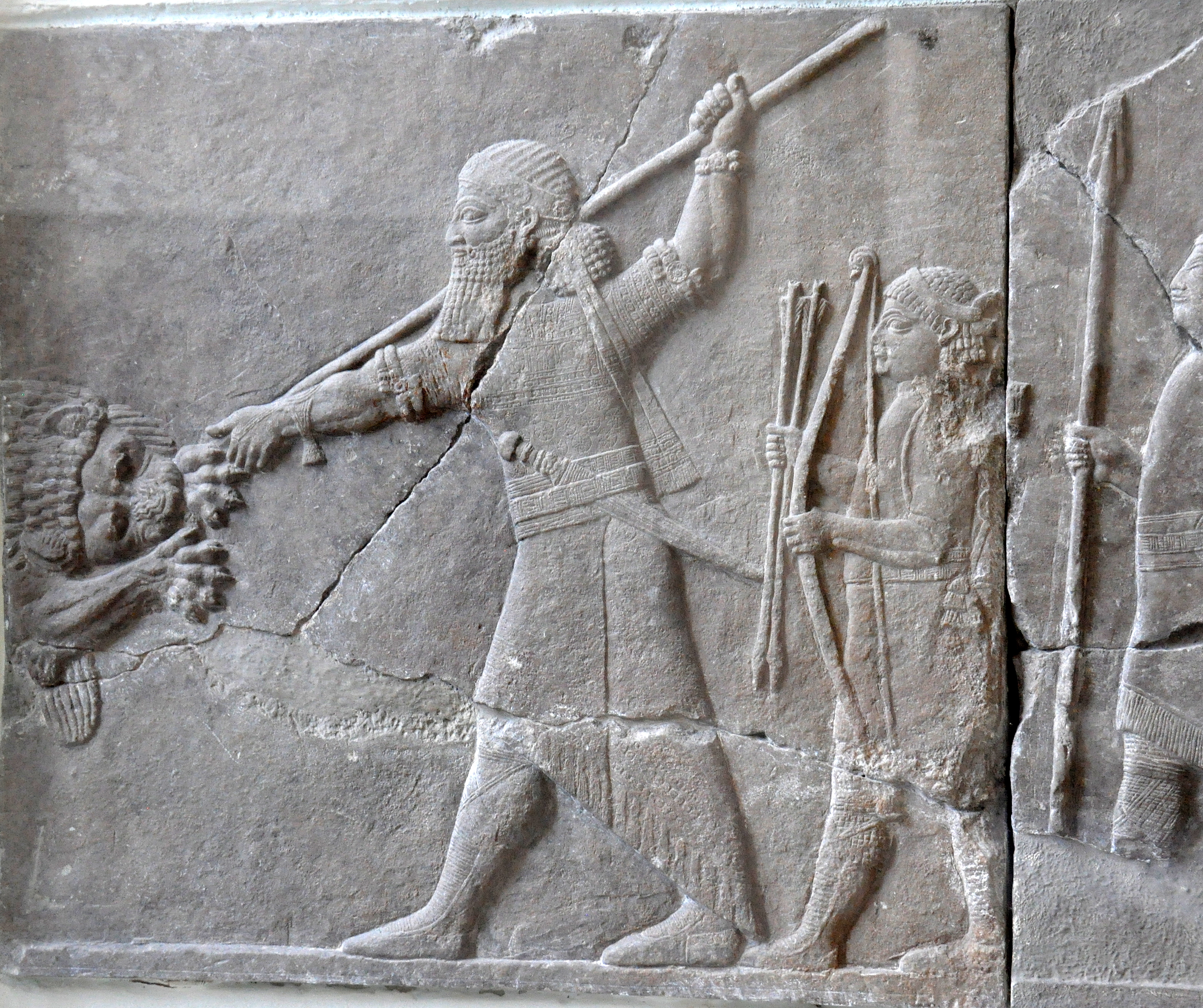Gypsum wall relief depicting the typical royal hunting of lions, part of a longer sequence. The king, Ashurbanipal II, thrusts a spear onto a leaping and furious lion. Behind him, an Elamite squire assists him. Partially appearing on the far right is a groom leading a horse. From the North Palace at Nineveh, Mesopotamia, modern-day Iraq. Neo-Assyrian Empire, reign of Ashurbanipal II, 668-627 BCE.