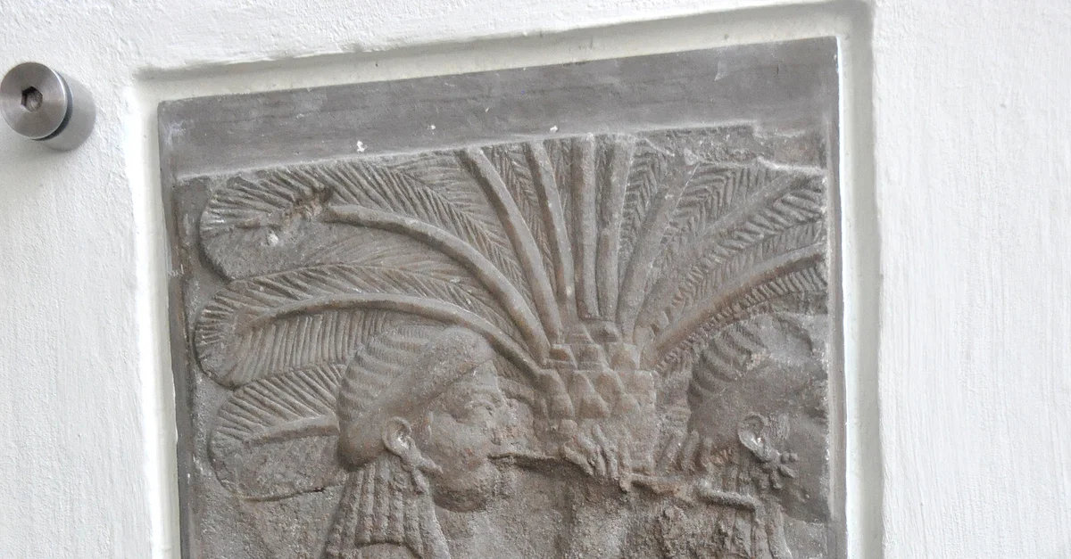 Gypsum wall panel depicting two female musicians beside a palm tree. From the North Palace at Nineveh, Mesopotamia, modern-day Iraq. Neo-Assyrian Empire, reign of Ashurbanipal II, 660-650 BCE.