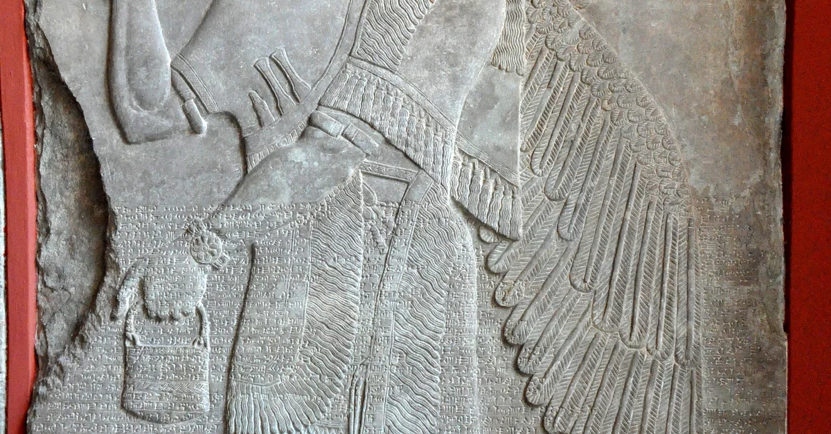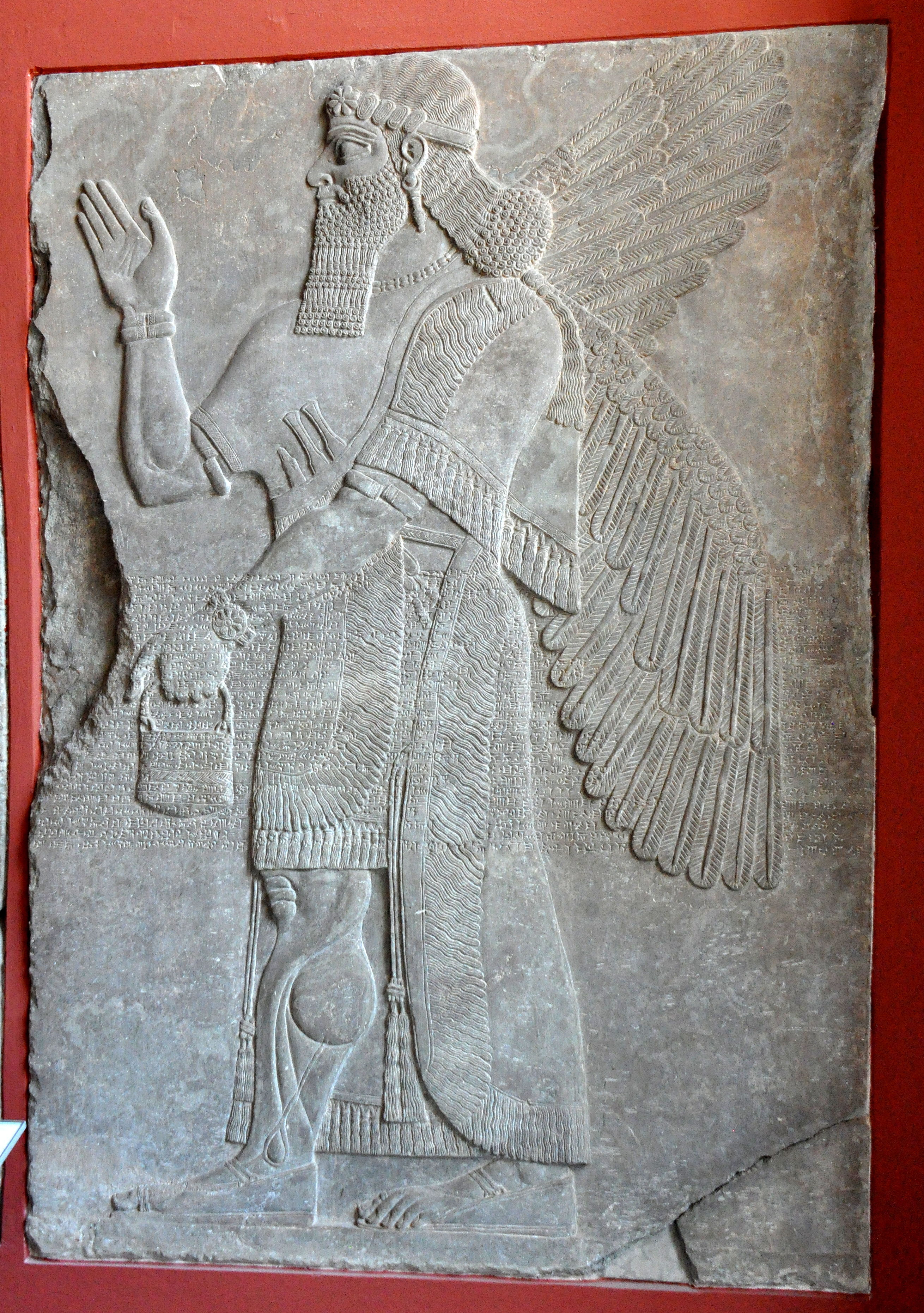 Alabaster bas-relief, depicting a standing human-headed genie or sage, from the North-West Palace of Ashurnasirpal II at Nimrud, Mesopotamia, modern-day Iraq. Neo-Assyrian Empire, 9th century BCE.