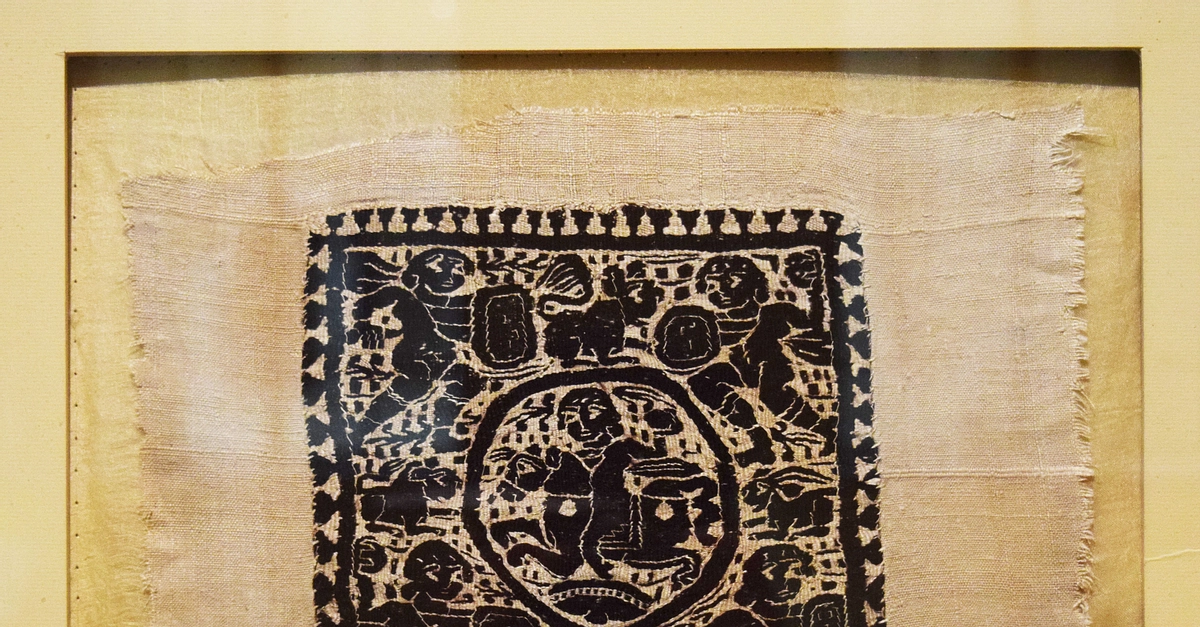 This Coptic linen textile spun from wool depicts scenes from the life of St. Joseph, including images of a horseman, four warriors, animals, a grapevine, a bird, and a running warrior holding a spear. Egypt, c. 300-700 CE. (Pushkin Museum, Moscow.)
