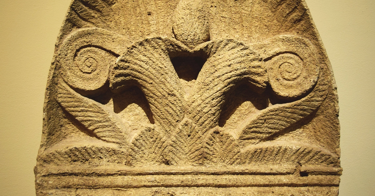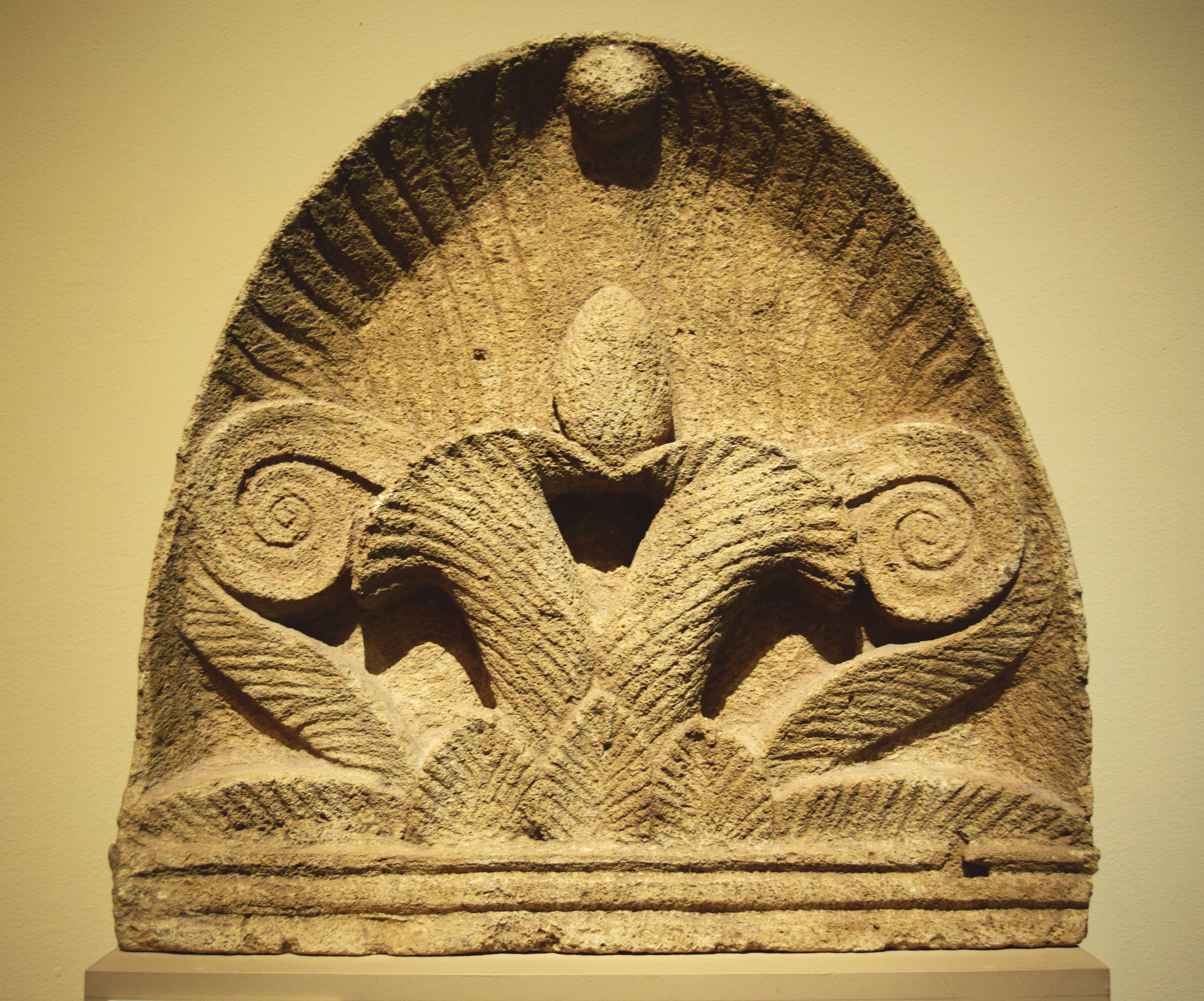 An ancient Greek acroterion (akroteria) or architectural ornament made of limestone, which was placed on a flat base and positioned at the top of a building constructed in the classical style. Greece, c. 250 BCE. (Pushkin Museum, Moscow)