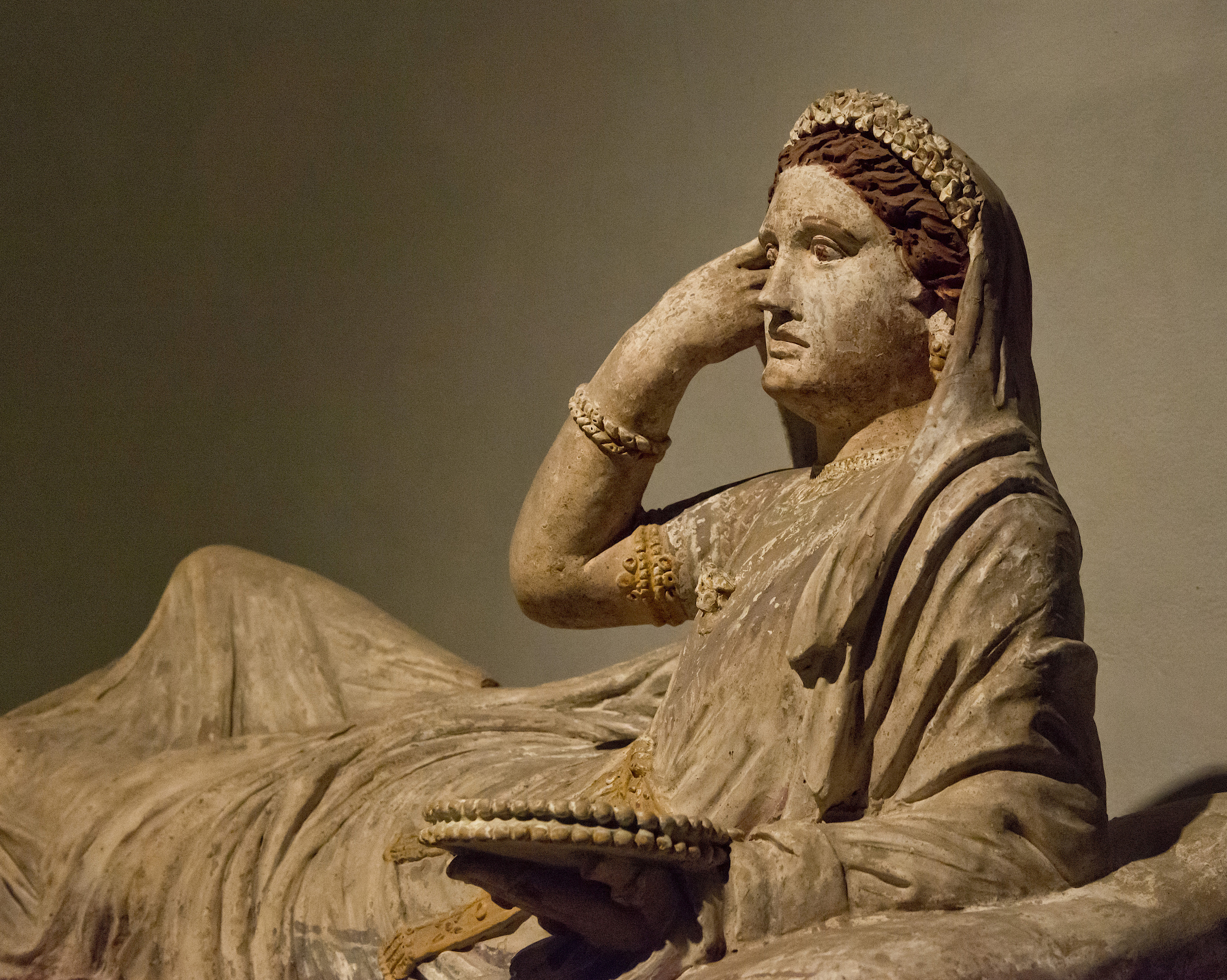 An Etruscan terracotta sarcophagus lid depicting one Larthia Seianti. 2nd century BCE, Near Chiusi, Italy. (Museo Archeologico Etrusco, Florence)