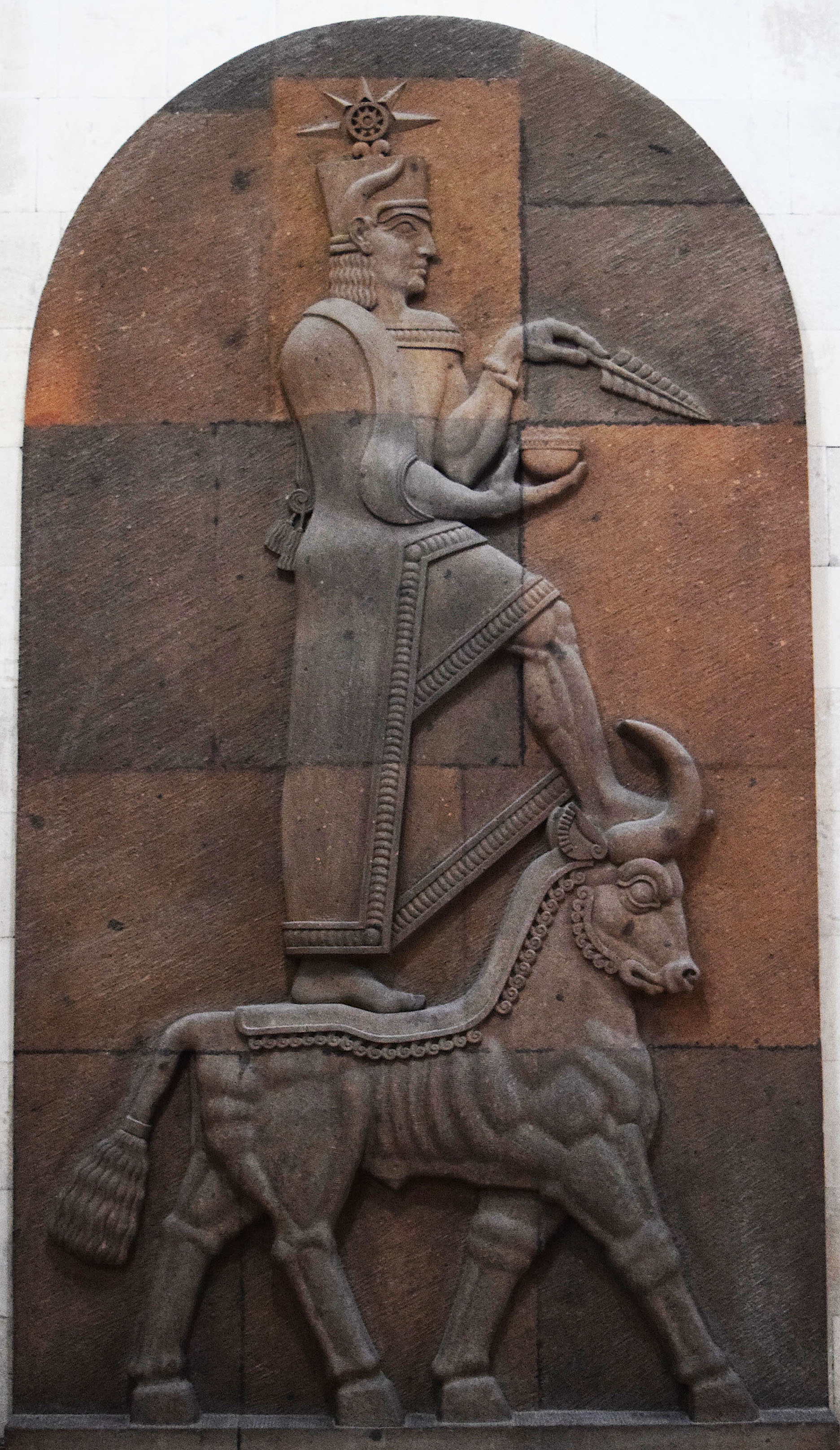 Teisheba was the second most powerful god of the Urartian pantheon and was worshipped at the ancient Erebuni fortress. Bas relief reconstruction, K. Gianjian. (Erebuni Historical and Archaeological Culture Preserve, Yerevan)