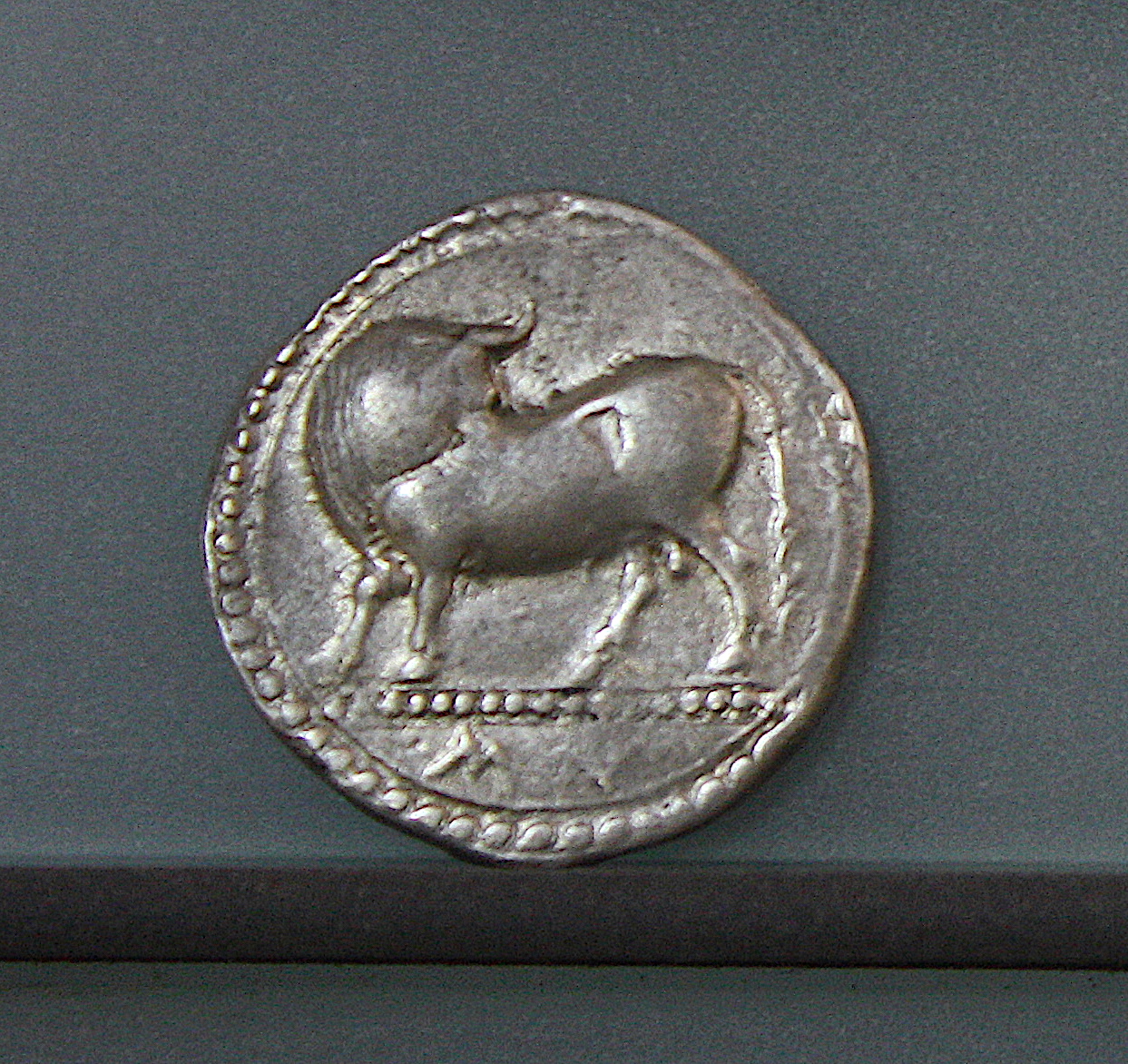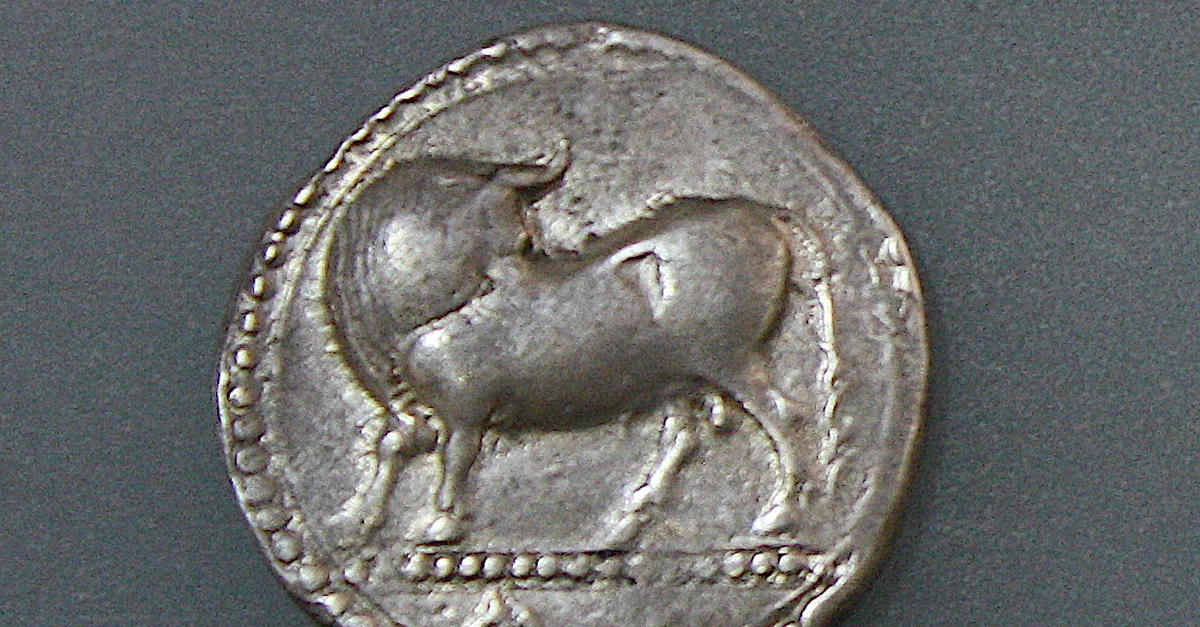 A silver stater of Sybaris, southern Italy. c. 550-510 BCE. (Archaeological Museum of Altamura, Italy)