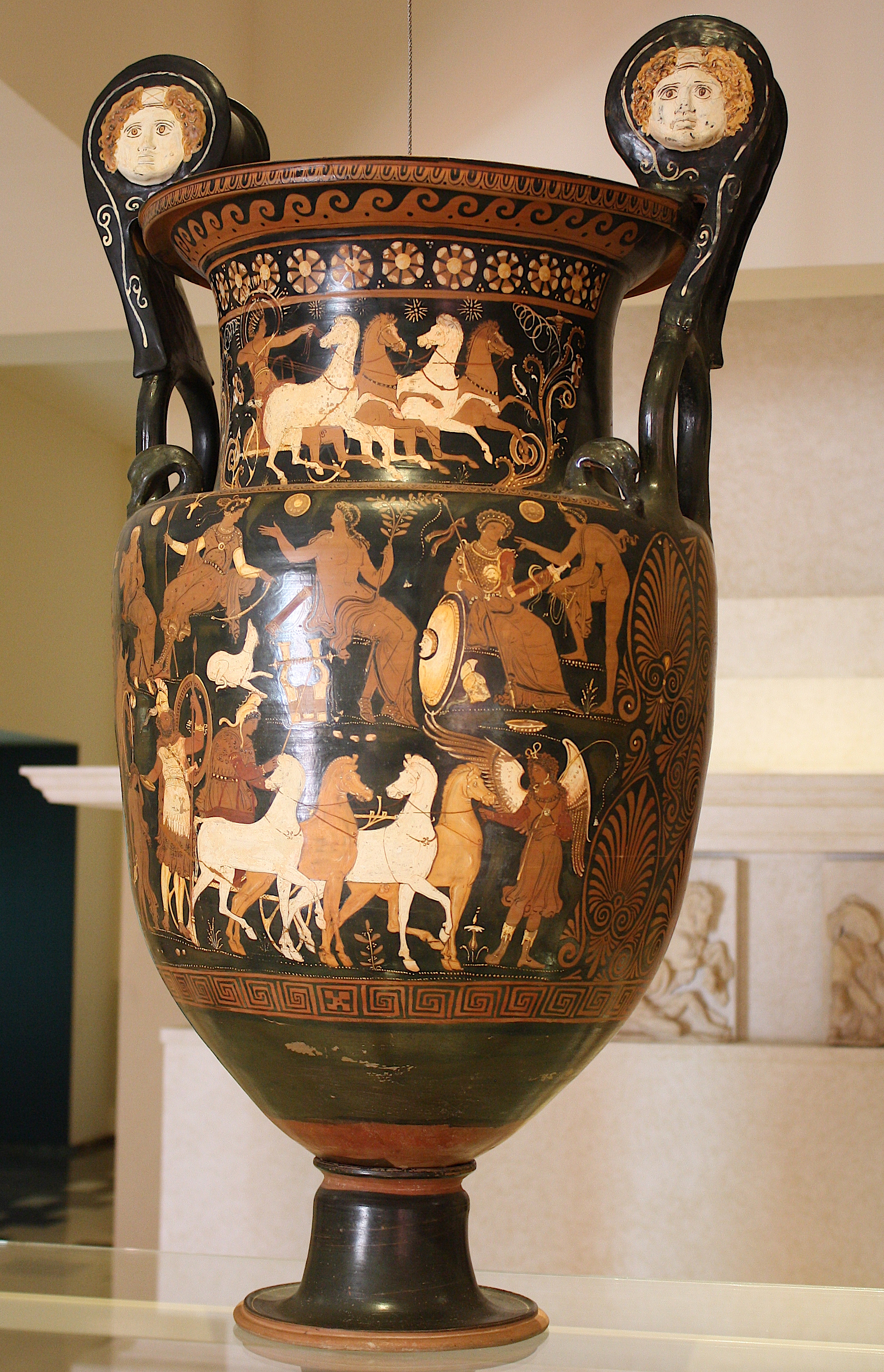 A red-figure volute krater. 330 BCE, Tarentum. (Archaeological Museum of Taranto, Italy)