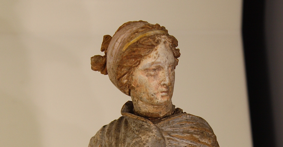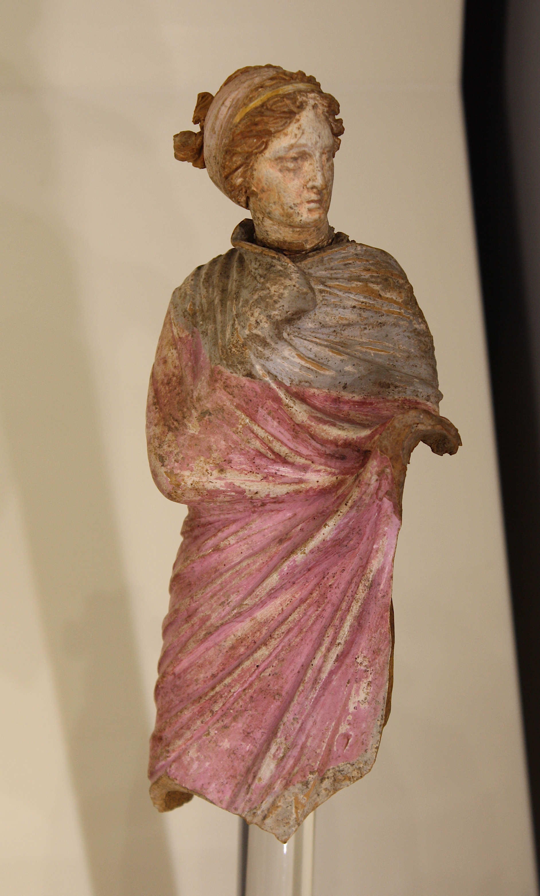 A painted terracotta figurine of a woman wrapped in a himation. Tarentum, 3rd century BCE. (Archaeological Museum of Taranto, Italy)