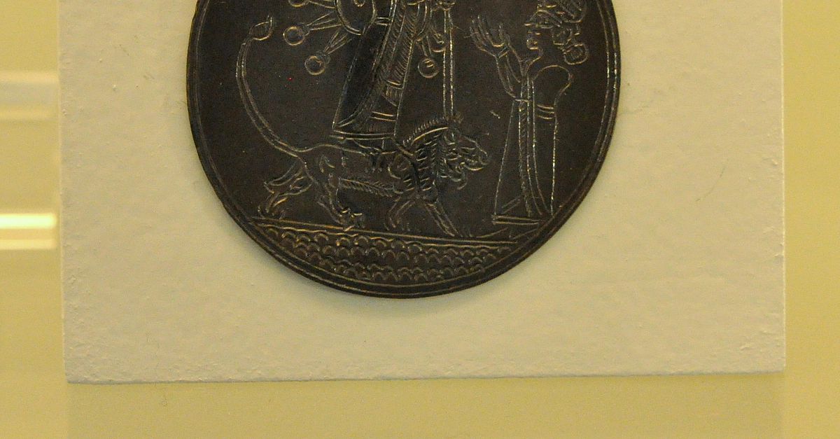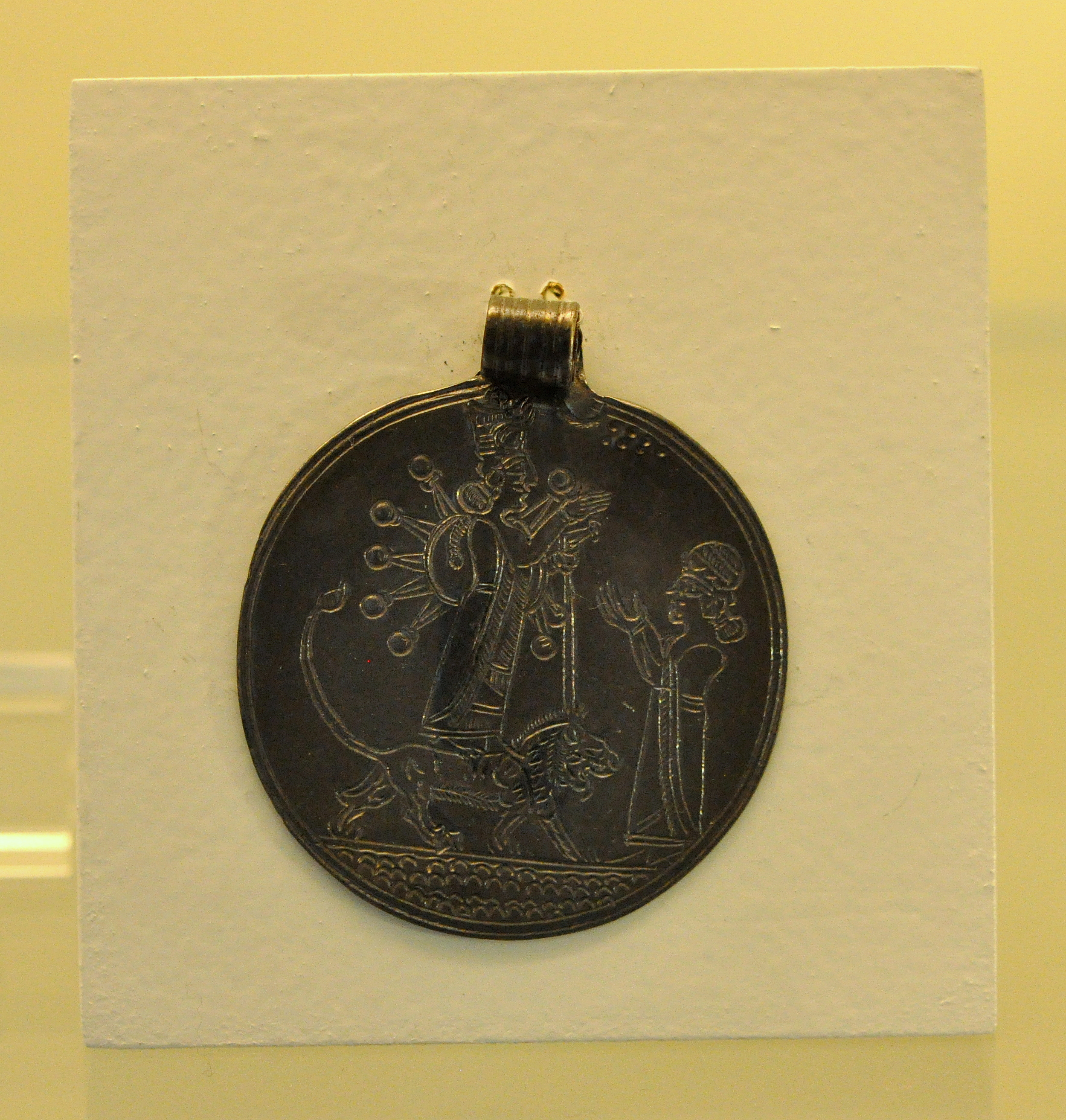 On this rounded silver pendant, a woman worships the goddess Ishtar who stands on a lion. 9th to 7th century BCE. From Sam'al/Zincirli, modern-day Southern Turkey. (Pergamon Museum, Berlin)