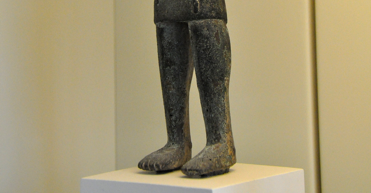 This a copper statuette of a warrior wearing a short kilt. He was probably holding weapons in his hands. Many similar statuettes were found and all of them were probably made in Lebanon. The characteristic features of this form of art are the drop-shaped face, rigid body posture, and the large eyes, which were previously inlaid. Circa 2000 BCE. From Upper Mesopotamia/modern-day Syria. (Pergamon Museum, Berlin,)