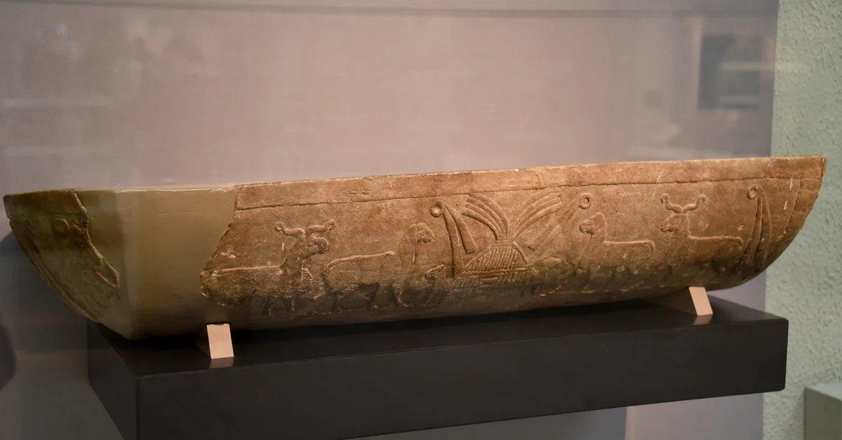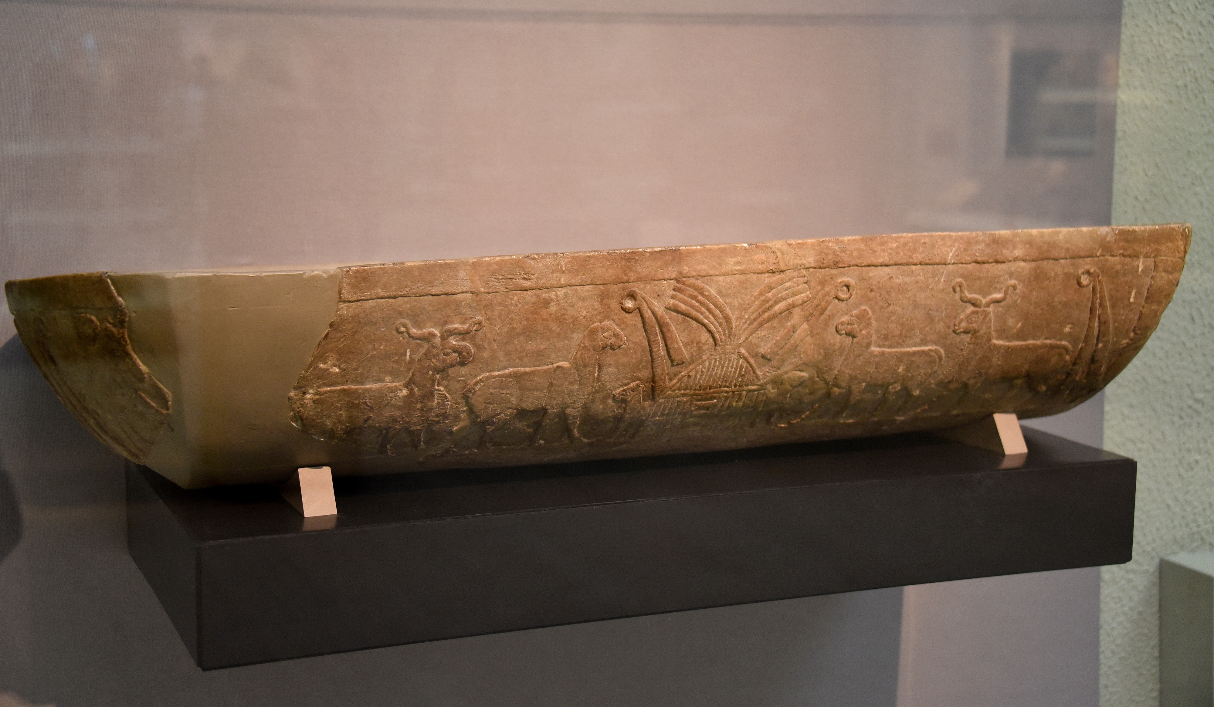 The Uruk Trough, one of the earliest examples of formal religious art from Mesopotamia. It was probably a cult object in the temple of Inanna (Ishtar); it cannot be used as a trough or basin. The carving shows sheep approaching a reed hut from which lambs emerge. The meaning of the scene is unknown but probably reflects the fertility of flocks under the protection of Inanna. The high volutes on either sides of the hut and elsewhere are symbols of the goddess Inanna. From Uruk (Warka), Southern Mesopotamia, modern-day Iraq, Late Uruk Period, 3300-3000 BCE.