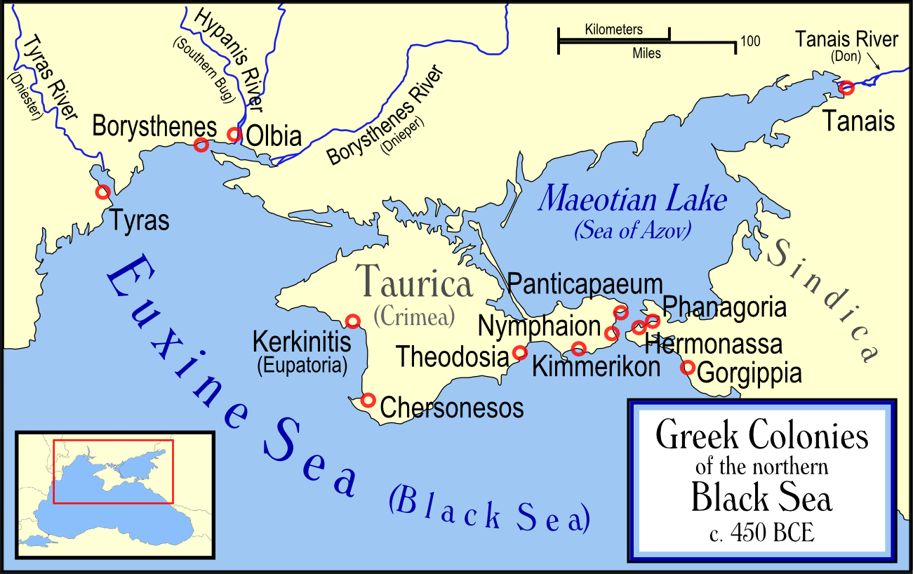 Map showing Ancient Greek colonies on the northern coast of the Black Sea, c. 450 BC.