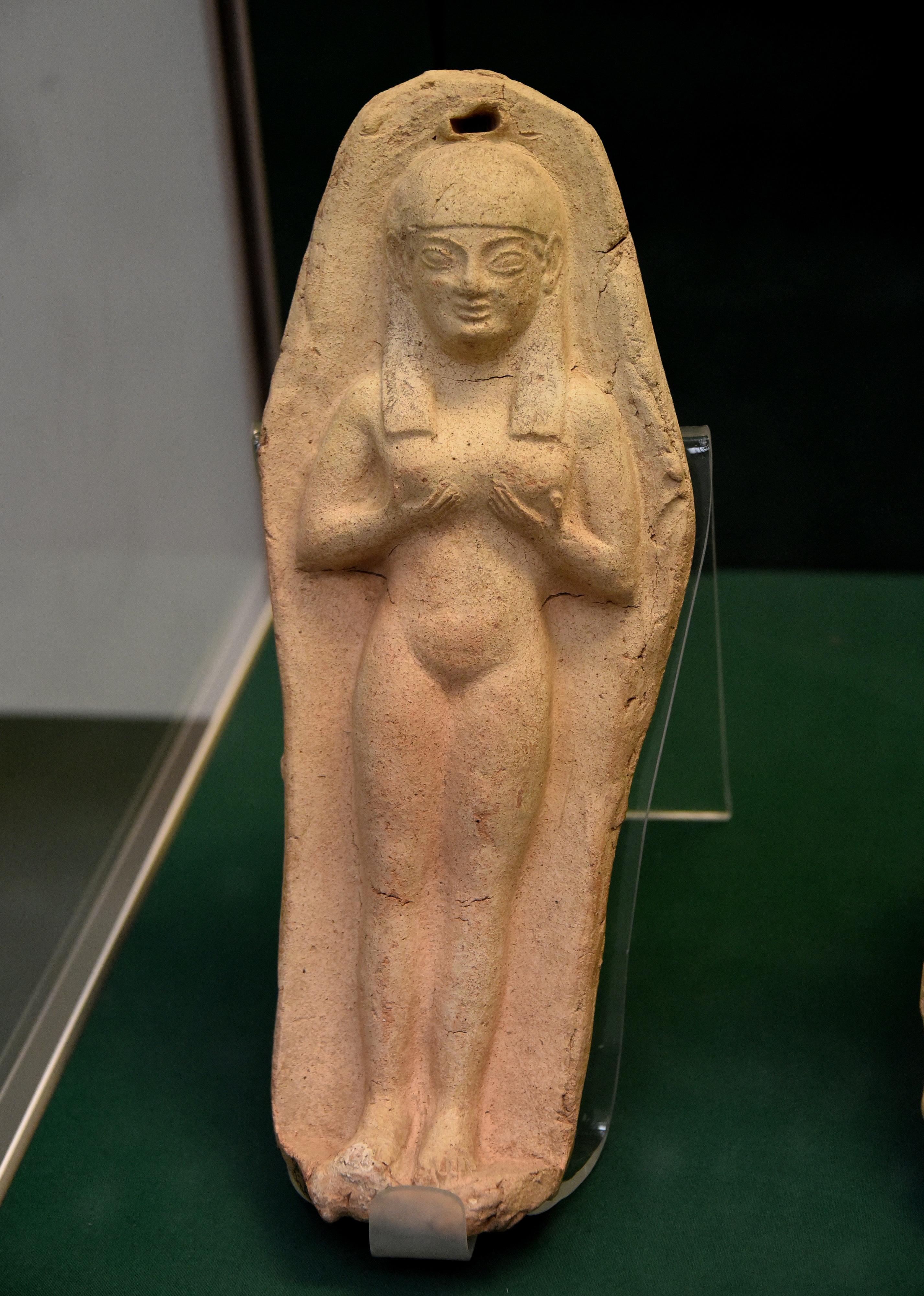 This is baked clay votive plaque of a nude woman in low relief, most likely the goddess Astarte. Her Egyptian style wig was painted black. She puts her hands at her breasts. The hole at the top is for suspension. This is a development of the Late Bronze Age Canaanite type. Phoenician or Cypro-Archaic, 6th century BCE. From Grave 11 at Tharros, Sardinia, modern-day Italy. (The British Museum, London)